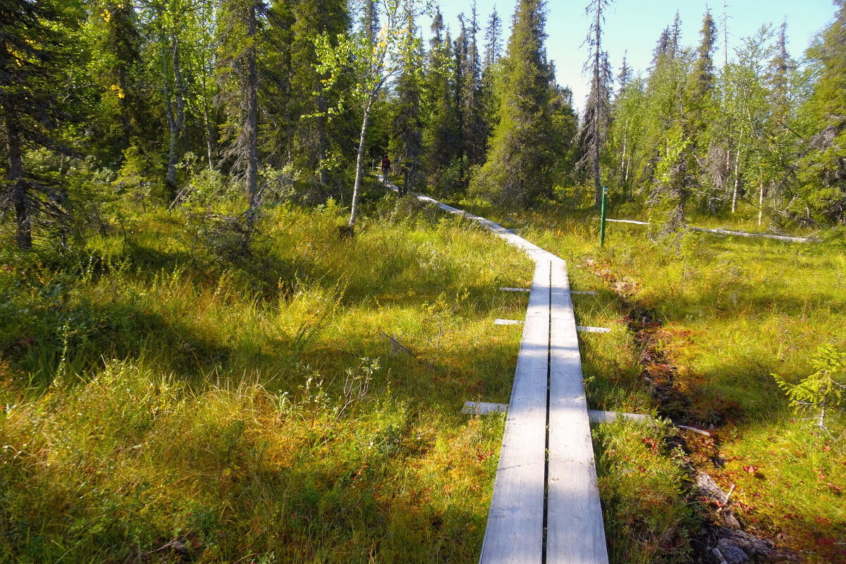 Beim Besucherzentrum in Tankavaara hat man mehrere Pfade angelegt, die zu Wanderungen in die sonst schwer bis kaum zugängliche nordische Landschaft einladen. Wir wählen den knapp 10 km langen Kuukkeli-Pfad., der auf den 429 m hohen Pikku Tankavaara hinaufführt.