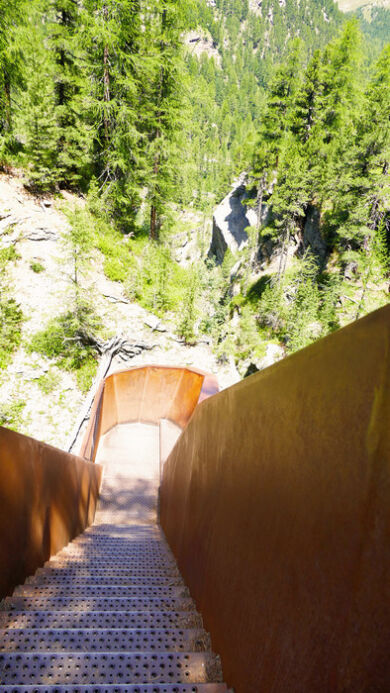 Um den Wanderern die Schlucht und ihre Schönheit näher zu bringen, wurden im Auftrag der Gemeinde Martell vier Schluchteninszenierungen mit vier imposanten, aber doch naturnahen Bauwerken aus Cortenstahl geplant, die die Schlucht hautnah erlebbar machen. Also Gischt zum Anfassen inklusive!