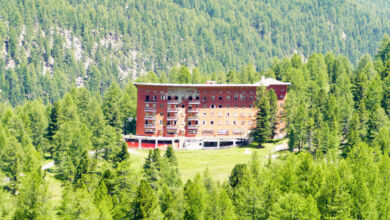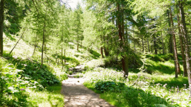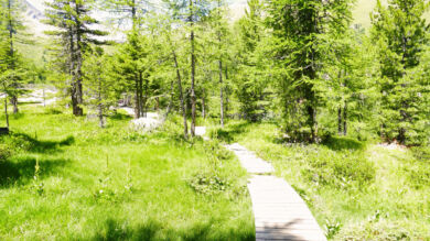 Start des Plima-Schluchtenweges ist am Parkplatz Hintermartell. Von hier aus wandern wir zunächst auf einem Fahrweg, überqueren eine Holzbrücke und erreichen einen kleinen Teich mit Blick auf die Ruine des ehemaligen Luxushotels Paradiso.