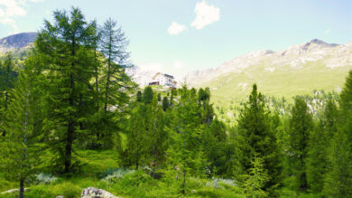 Die Zufallhütte liegt auf einer kleinen Hochebene, umgeben von den Bergen der Ortler-Alpen, mit einem tollen Panorama.