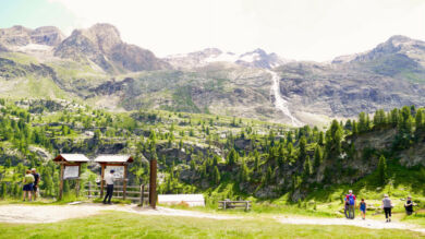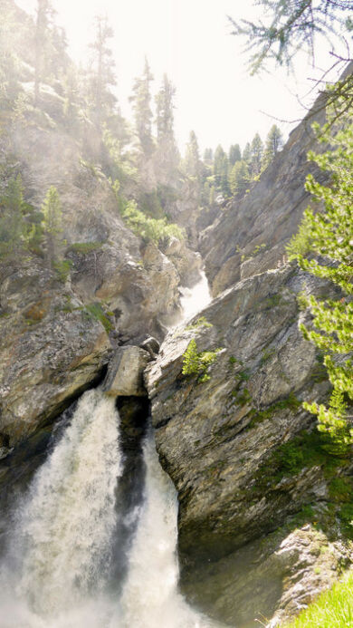 Die Zufallhütte (die Betonung liegt auf der zweiten Silbe, also Zufàll, “beim Fall”; italienisch Rifugio Nino Corsi) liegt auf 2.265 m Höhe im inneren Martelltal, einem südlichen Seitental des Vinschgaus, in den Ortler-Alpen. Vom Parkplatz Hintermartell wandern wir auf dem Plima-Schluchtenweg aufwärts zur Hütte, vorbei an vier spektakulären Erlebnispunkten: Kelle in der Klamm, Panoramasichel, Aussichtskanzel und Hängebrücke. Dabei erleben wir eine tolle Naturarena hautnah mit Gischt und Paradies-Potential.