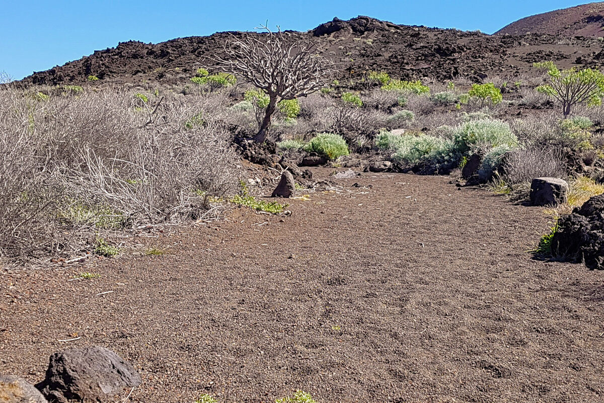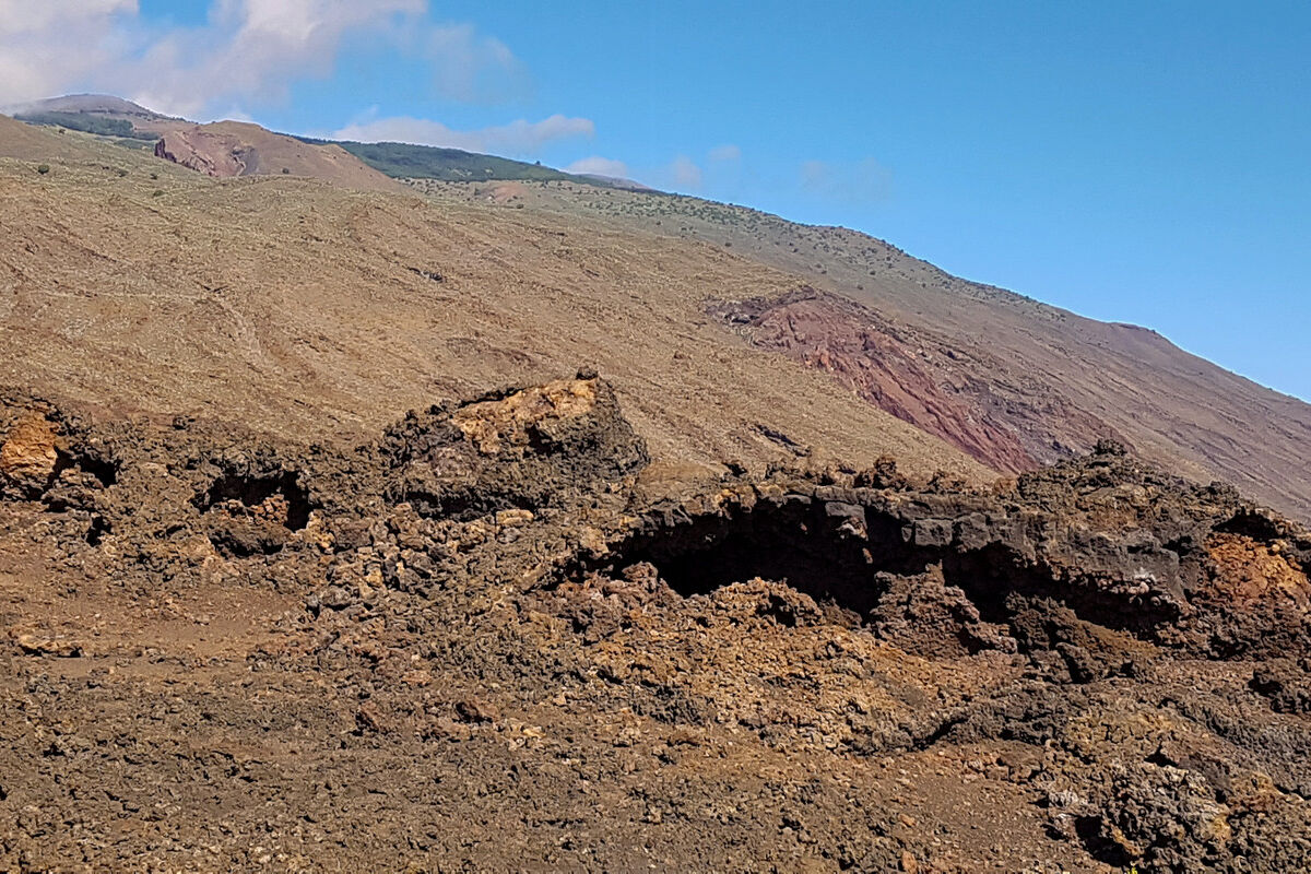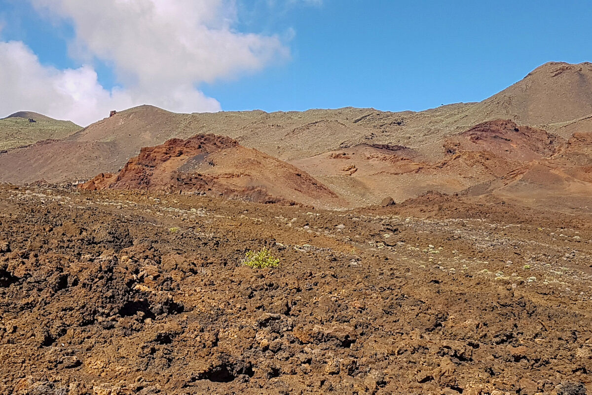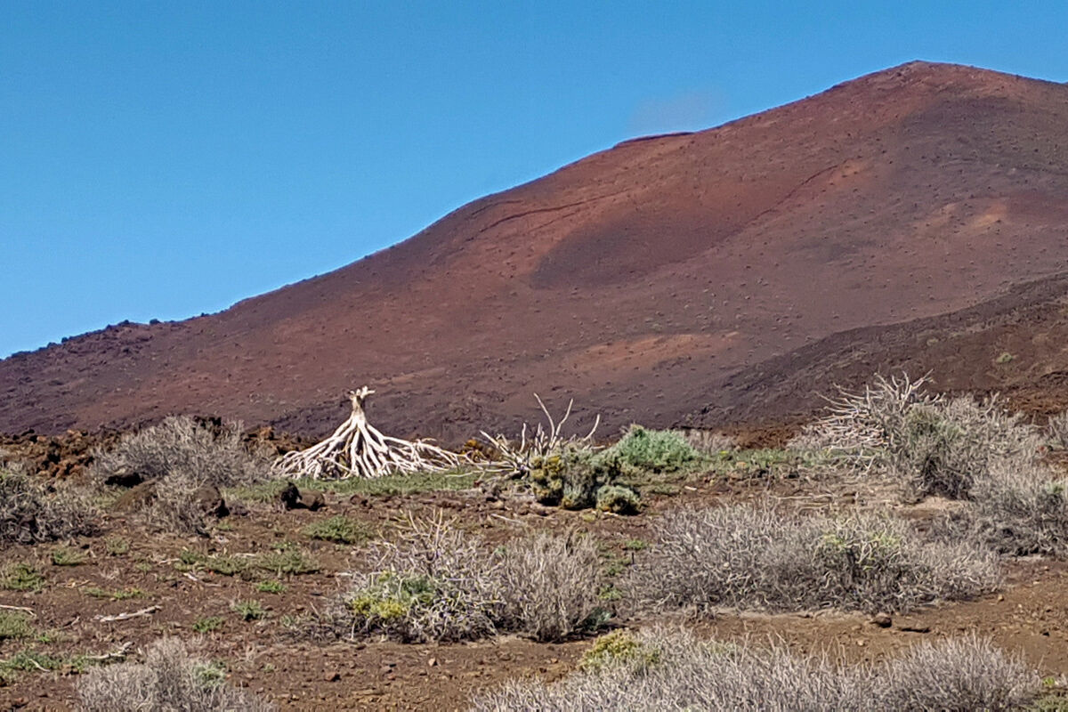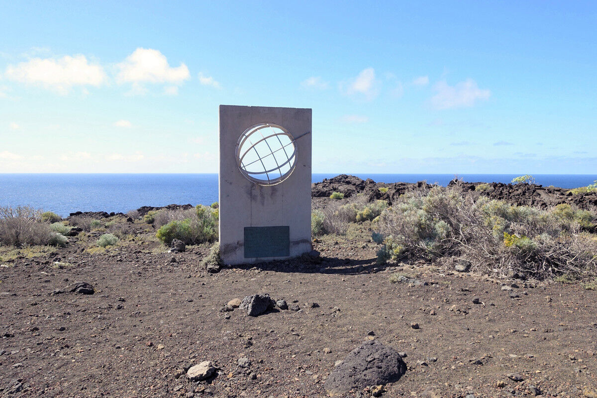 Der Abstieg über Piste und Pfad ist, abgesehen von den herrlichen Ausblicken und der beeindruckenden Lavalandschaft, nicht unbedingt ein Highlight: heiß und staubig. Dafür erwartet uns ein besonderes Ziel: das ehemalige Ende der Welt. Ein schlichter Steinquader mit einer stilisierten Erdhälfte symbolisiert den ehemaligen Nullmeridian.