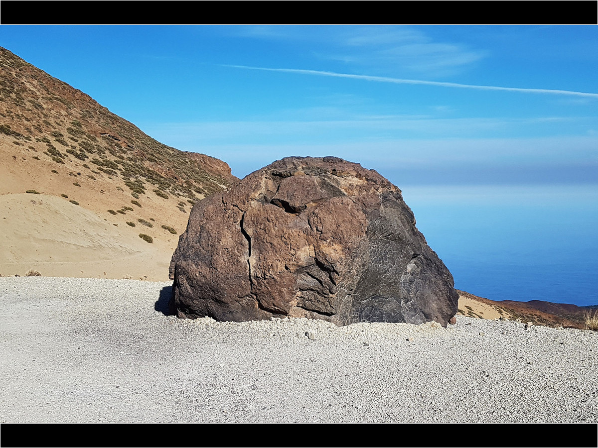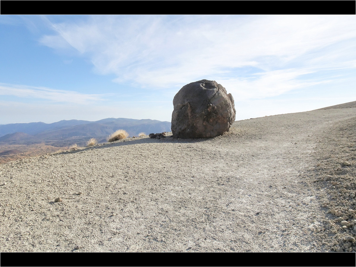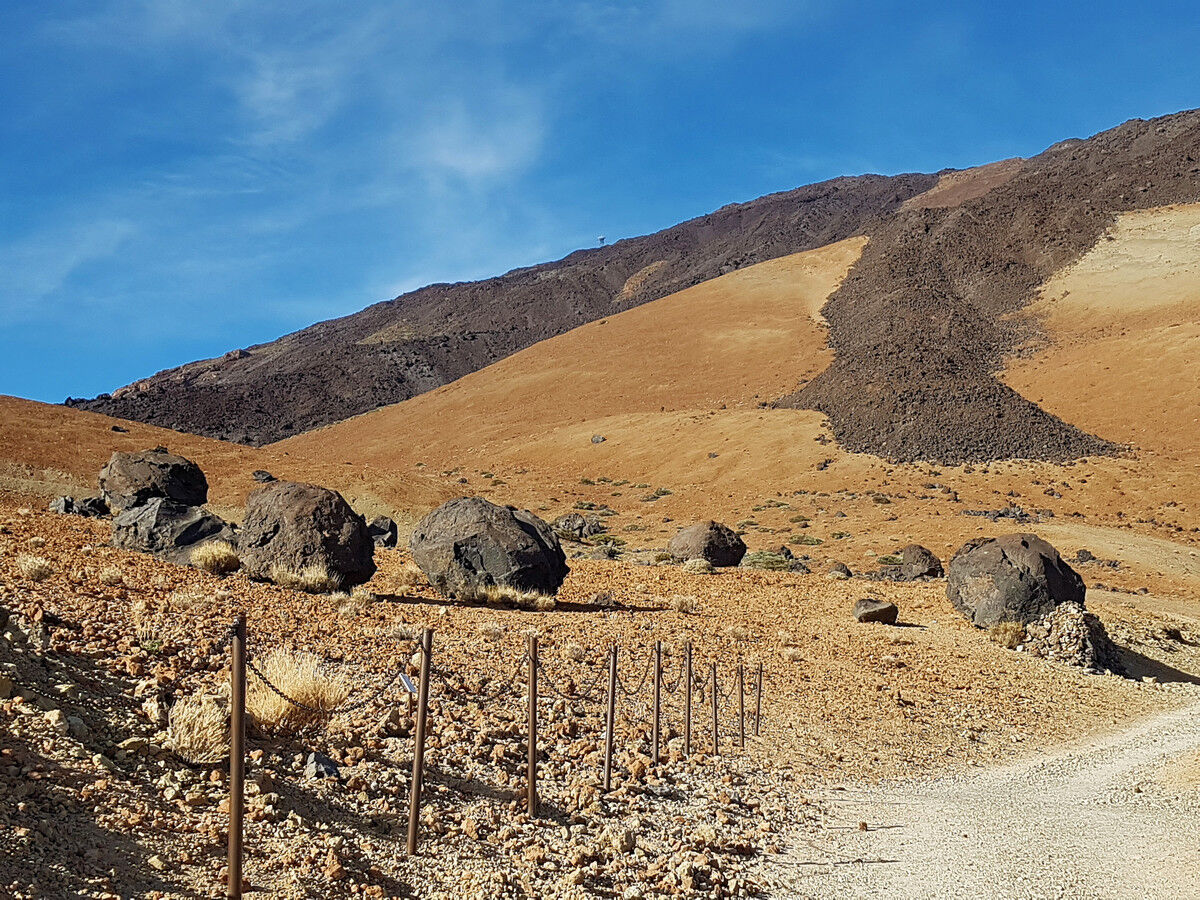 Vom Parkplatz an der TF-21 führt ein Fahrweg in Richtung Teide, der zunächst nur leicht durch die hellbeigen Bimssteinhänge ansteigt. In weiten Serpentinen windet sich der breite Weg den Hang der Montaña Blanca hinauf. Nach einiger Zeit passieren wir die so genannten Teideeier (Huevos del Teide). Das sind große Felskugeln aus schwarzer Lava, die sich eindrucksvoll vom weißen Bimsstein abheben. Hier, am Gipfel der Montaña Blanca, haben wir auf einem angenehmen Weg etwa 4,5 km und 370 Höhenmeter zurückgelegt. Eigentlich nichts Besonderes …
