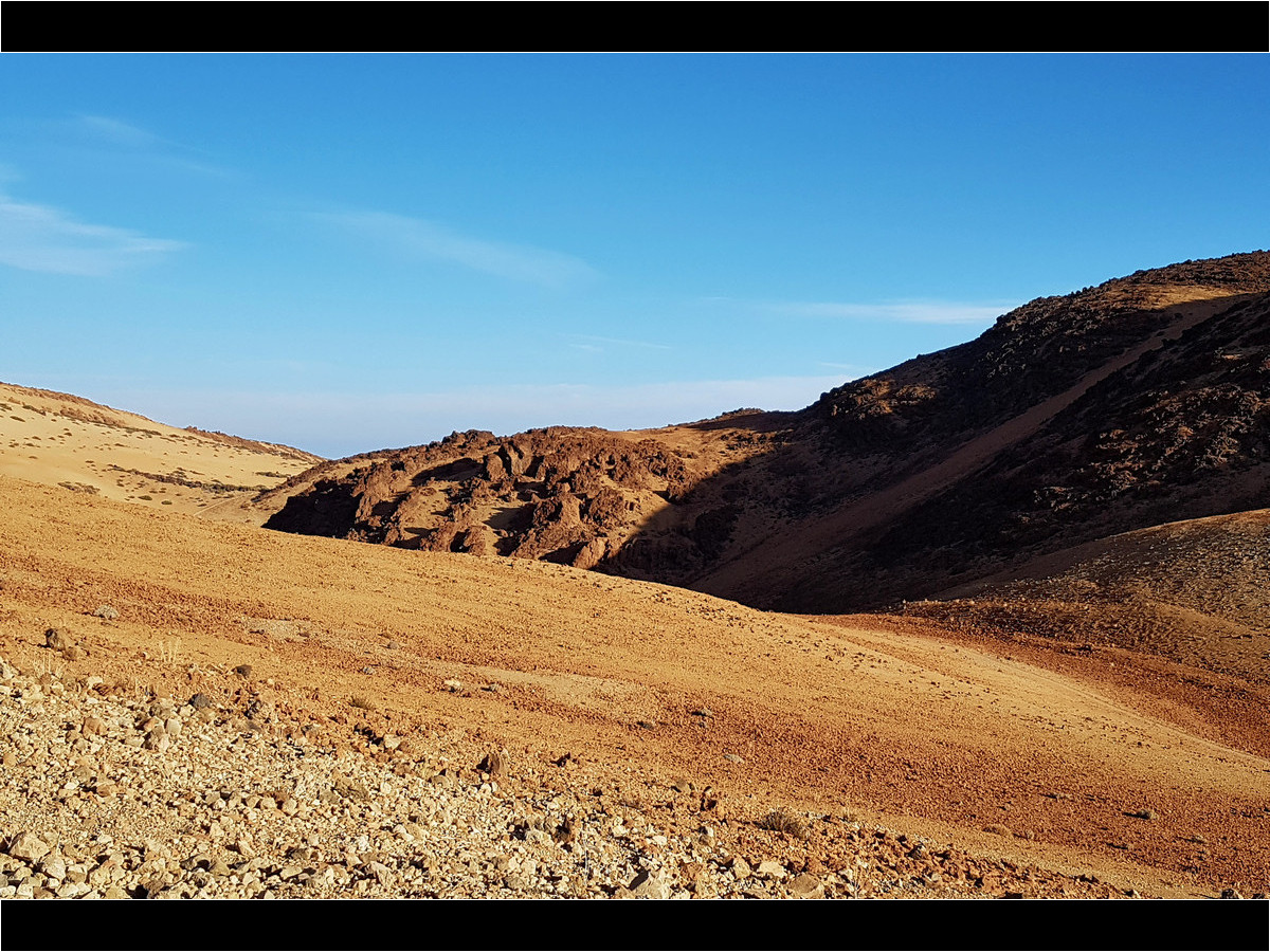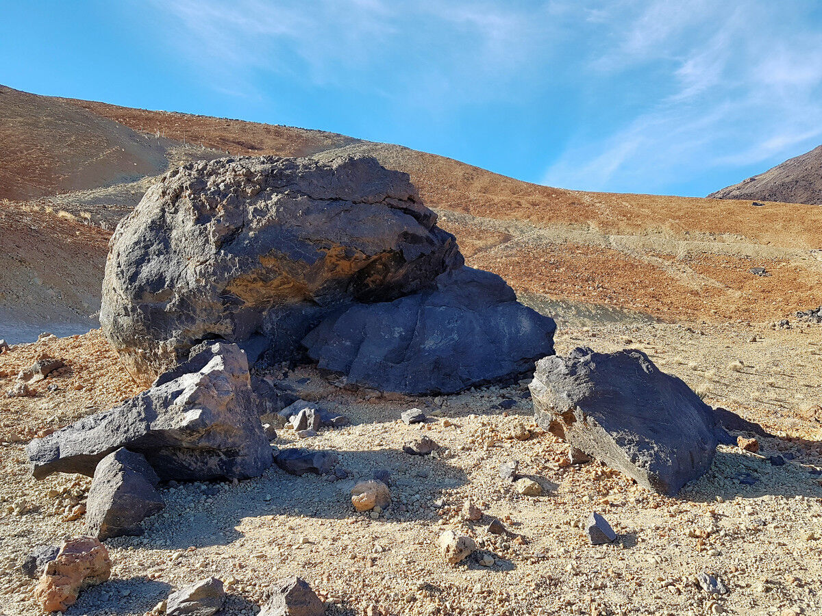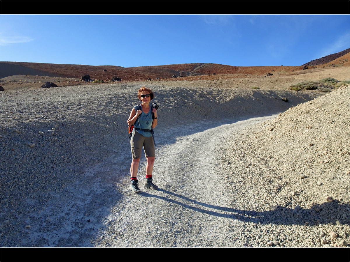 Vom Parkplatz an der TF-21 führt ein Fahrweg in Richtung Teide, der zunächst nur leicht durch die hellbeigen Bimssteinhänge ansteigt. In weiten Serpentinen windet sich der breite Weg den Hang der Montaña Blanca hinauf. Nach einiger Zeit passieren wir die so genannten Teideeier (Huevos del Teide). Das sind große Felskugeln aus schwarzer Lava, die sich eindrucksvoll vom weißen Bimsstein abheben. Hier, am Gipfel der Montaña Blanca, haben wir auf einem angenehmen Weg etwa 4,5 km und 370 Höhenmeter zurückgelegt. Eigentlich nichts Besonderes …