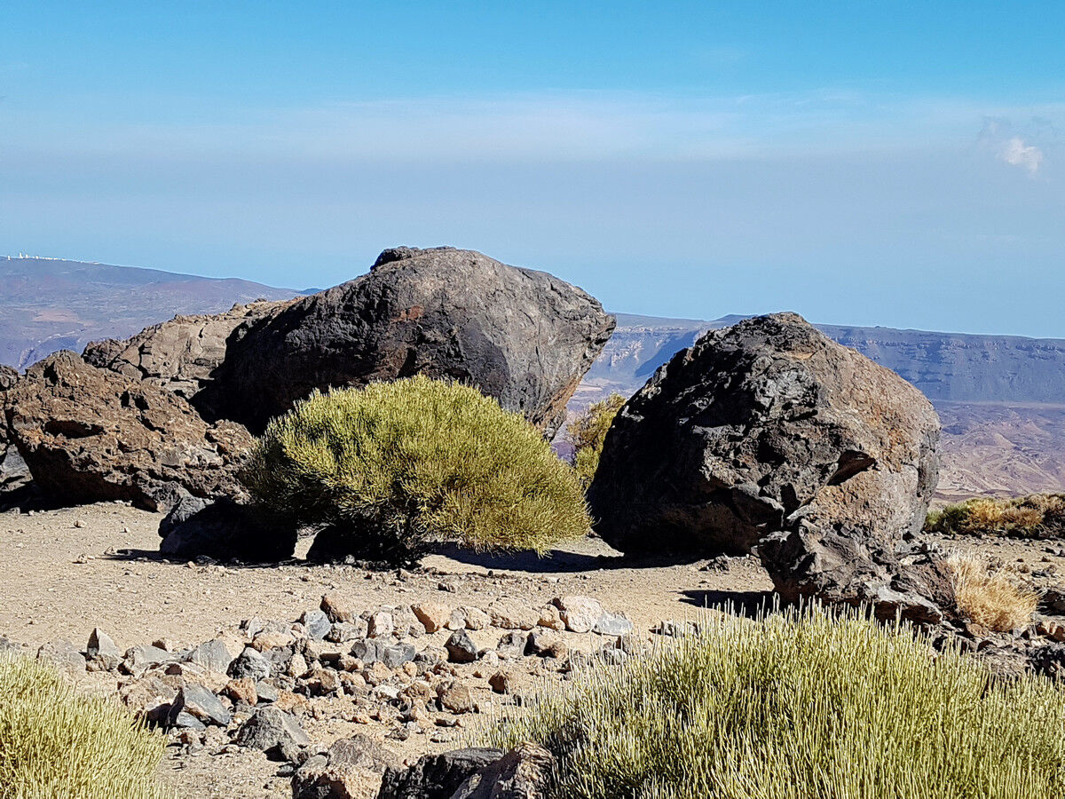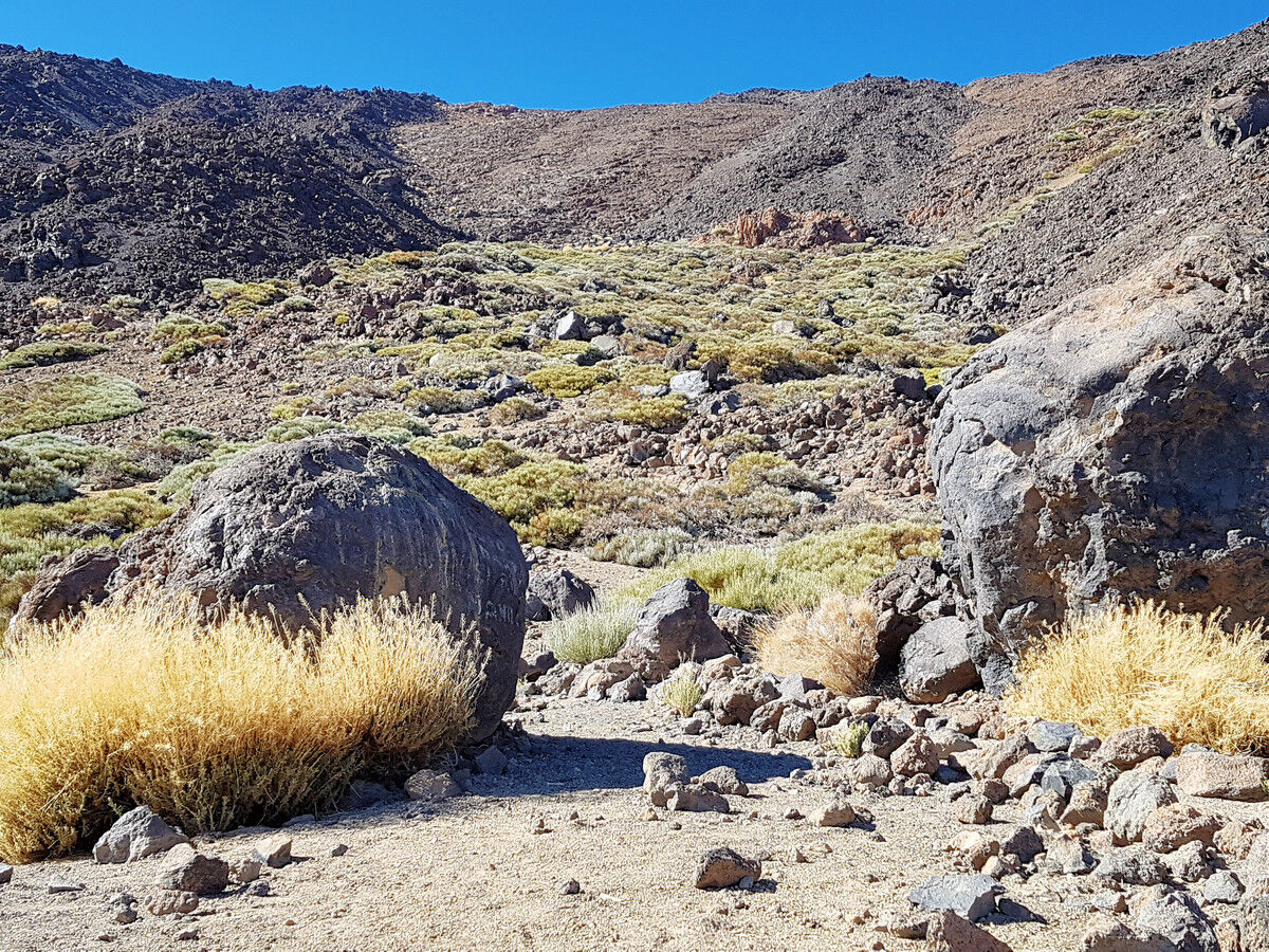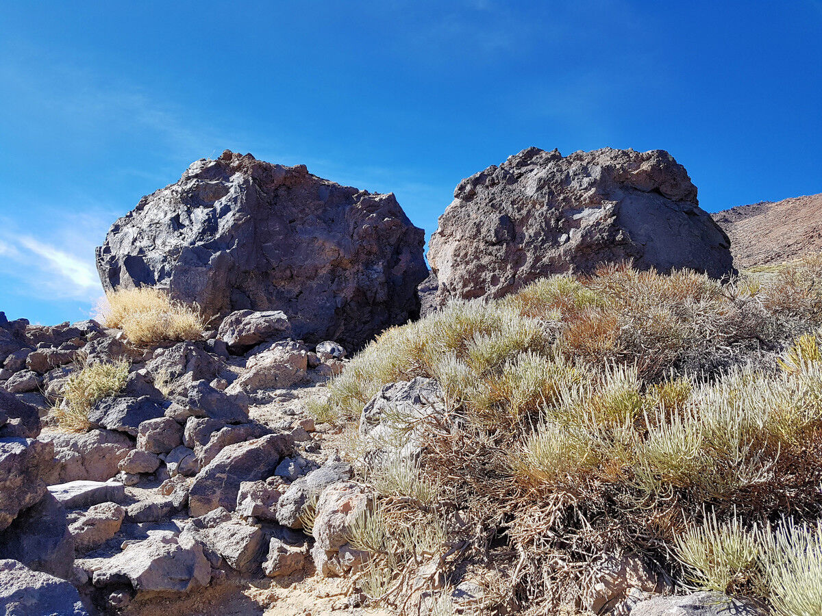 Nach einiger Zeit passieren wir eine kleine Hochebene mit riesigen Felsblöcken, die Estancia de los Ingleses (Aufenthalt der Engländer). Hier campierte seinerzeit Alexander von Humboldt während der Besteigung des Teide. Kurz danach kommt eine ähnliche Ebene, die Estancia de los Alemanes (Aufenthalt der Deutschen). Für uns sind die Ebenen eine willkommene Gelegenheit für eine kurze Verschnaufpause.