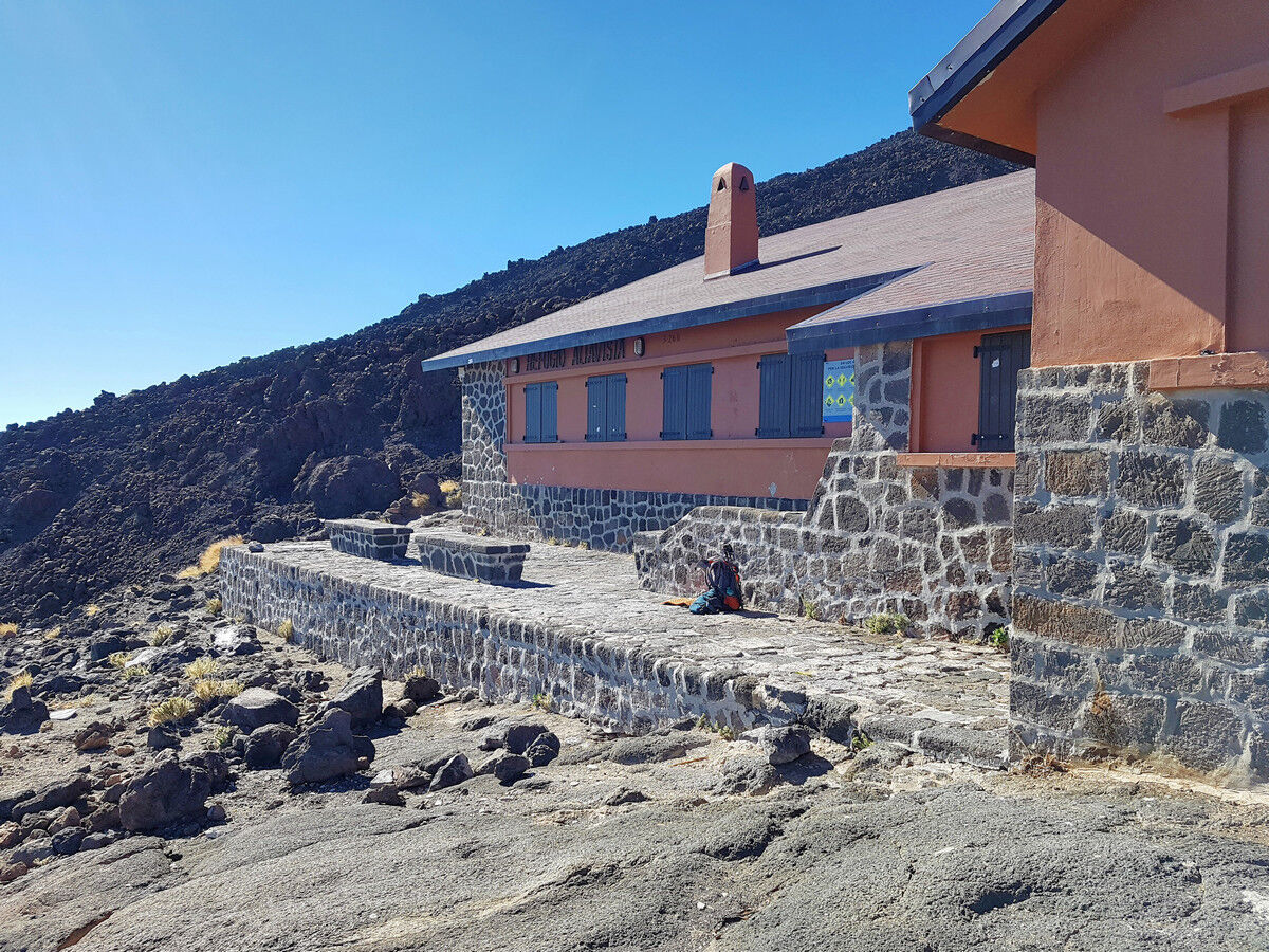 Danach geht es weiter sehr steil bergauf, es ist der letzte große Anstieg vor dem Refugio de Altavista. Über Fels und Geröll steigen wir nach oben. Dann sehen wir zunächst nur einen Mast. Unvermittelt taucht auch schon die Berghütte, das Refugio de Altavista, in einer Höhe von 3.260 Metern, vor uns auf.