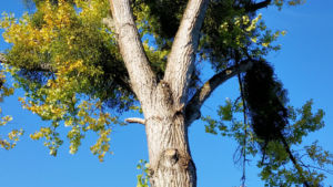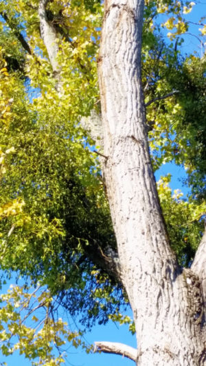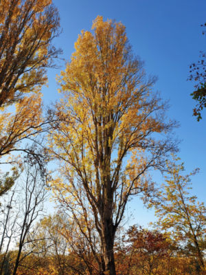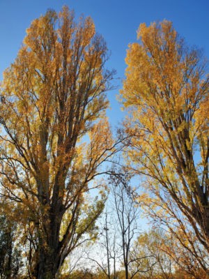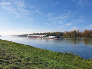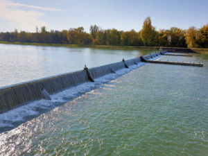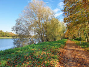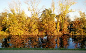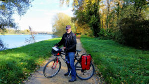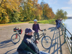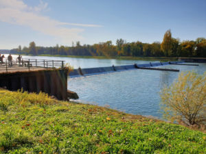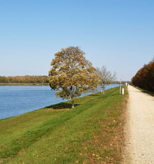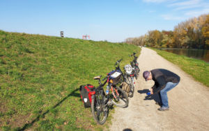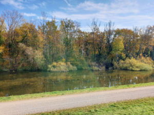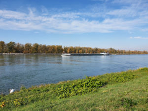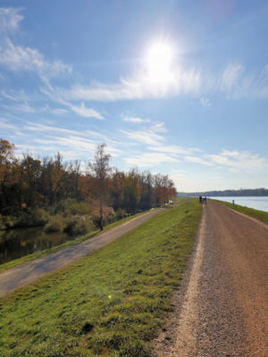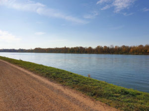Nach gut 2,5 km auf der Straße durch Breisach erreichen wir einen Parkplatz am Waldrand der Rheinaue. Hier fahren wir wenige Meter durch den Wald bis zum Damm des Rheinseitenkanals, dem wir nun für etwa 25 km rheinabwärts folgen. Hin und wieder verlässt der Weg den Damm und führt entlang von Altarmen durch den herbstlich bunt gefärbten Auwald. Dabei passieren wir mehrere Stauwehre und kleine Yachthäfen, ab und zu sehen wir ein großes Lastschiff auf dem Rhein.