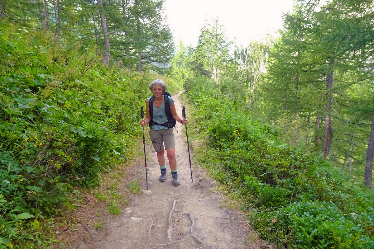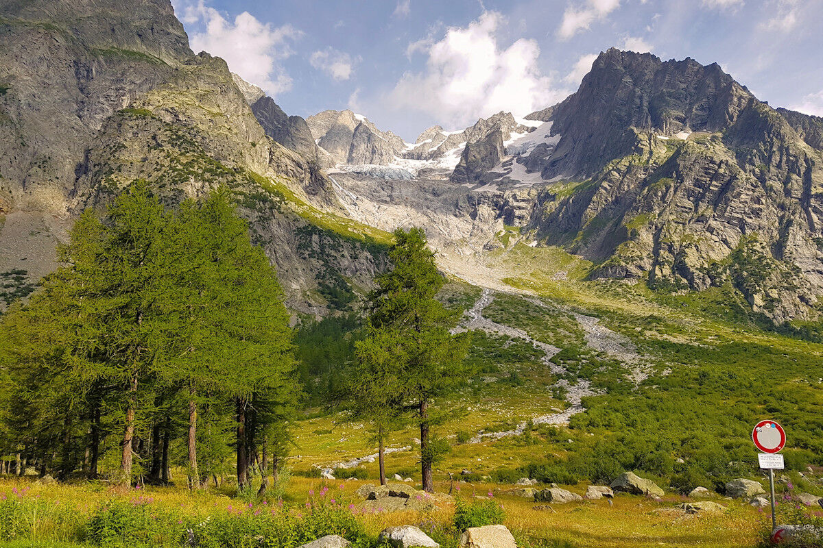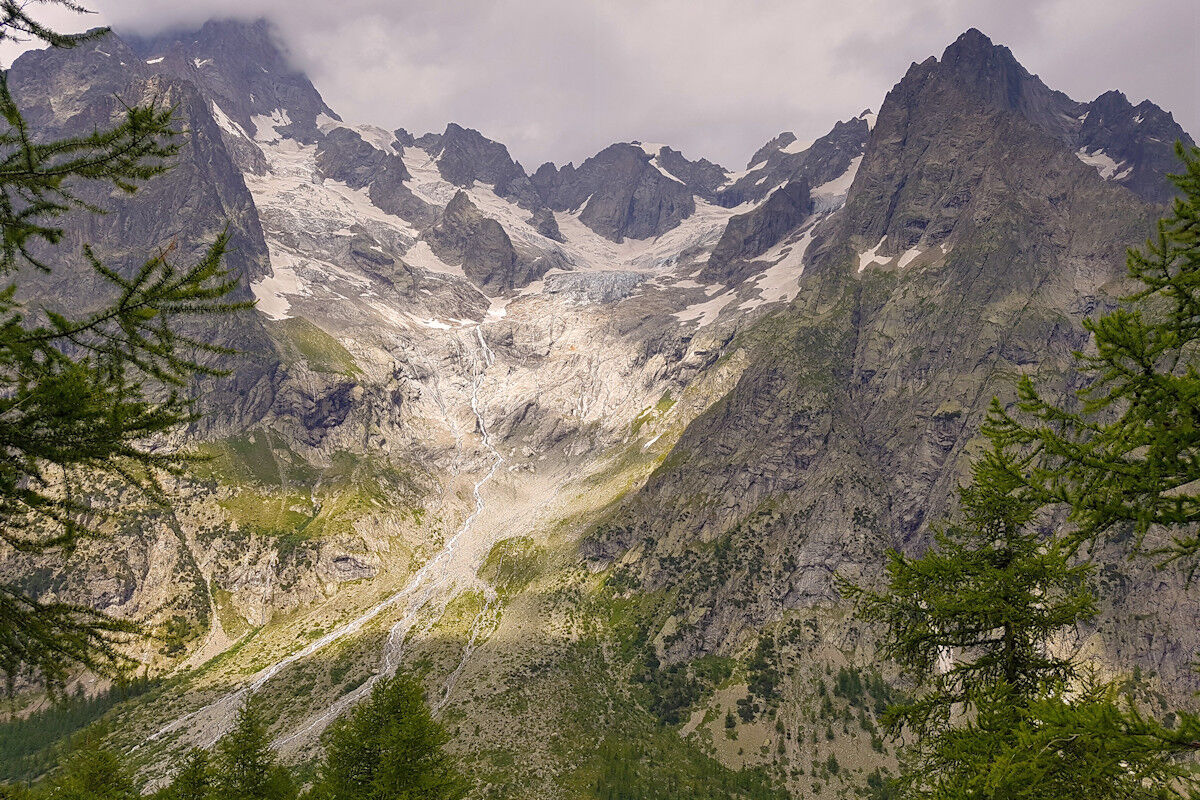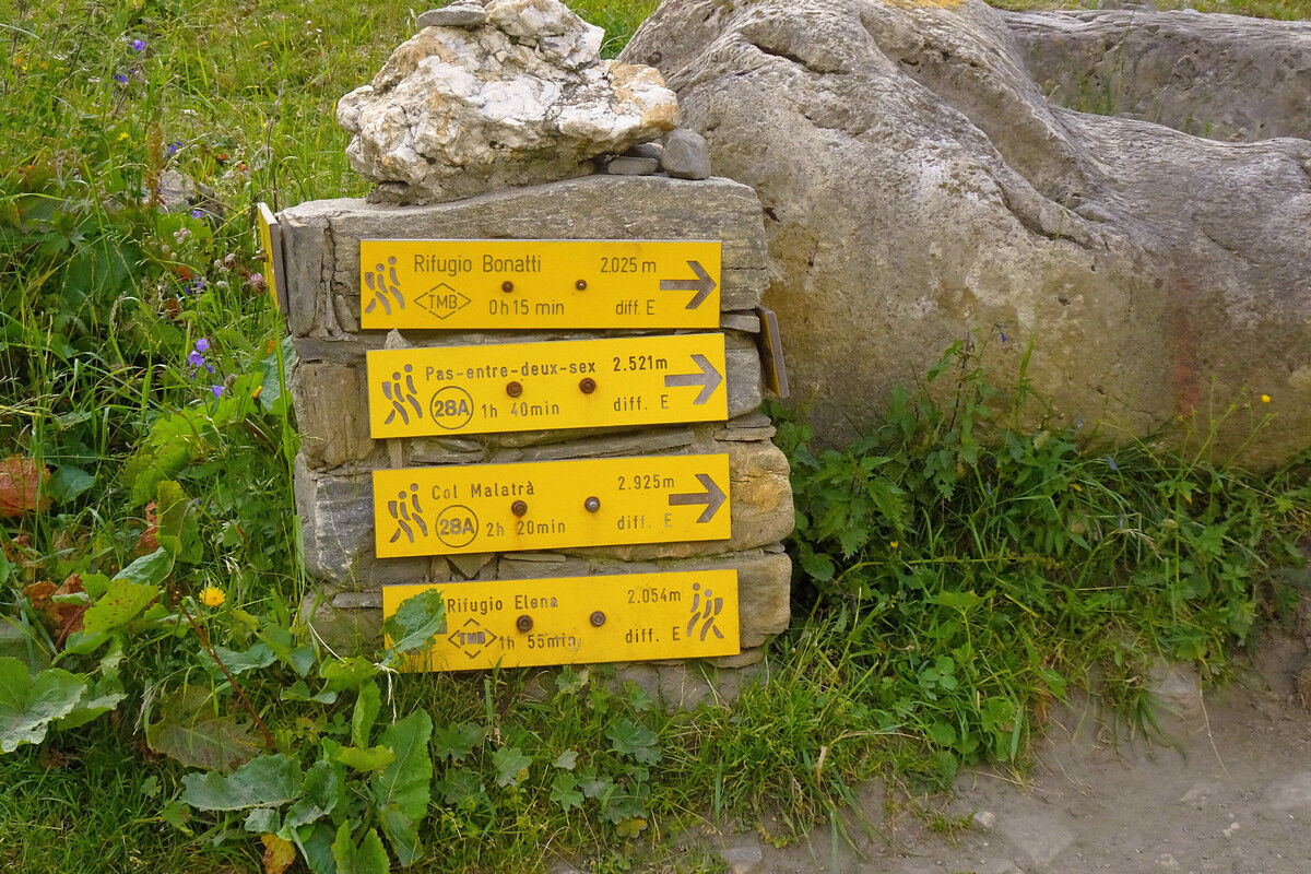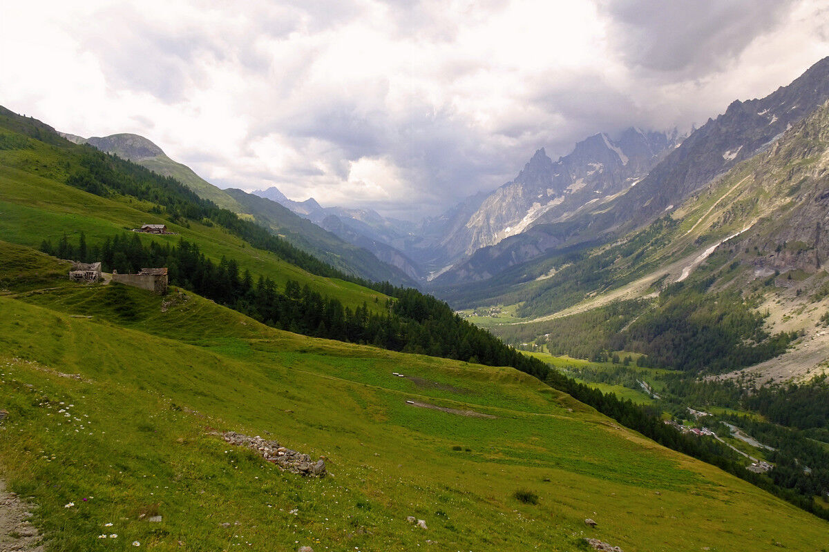 Vom Rifugio Bonatti geht es auf dem TMB, einem Panoramaweg am Südosthang des italienischen Val Ferret, Richtung Nordosten. Auf der ganzen Strecke fasziniert die grandiose Aussicht auf das Mont-Blanc-Massiv auf der gegenüberliegenden Talseite. Dieser Abschnitt der TMB lädt zum Flanieren und Genießen ein. Doch im Westen über Courmayeur verdunkelt sich der Himmel zusehends, ein Gewittergrollen ist zu hören, ein paar Regentropfen lassen uns schneller gehen – aber alles zieht an uns vorbei, das schöne Wetter kehrt zurück.