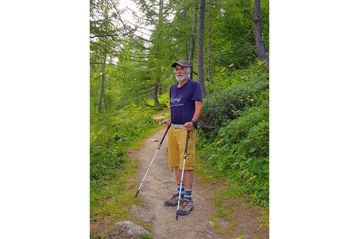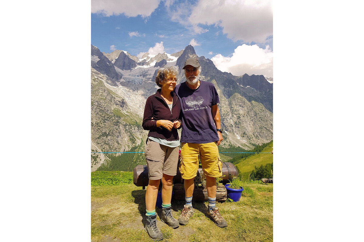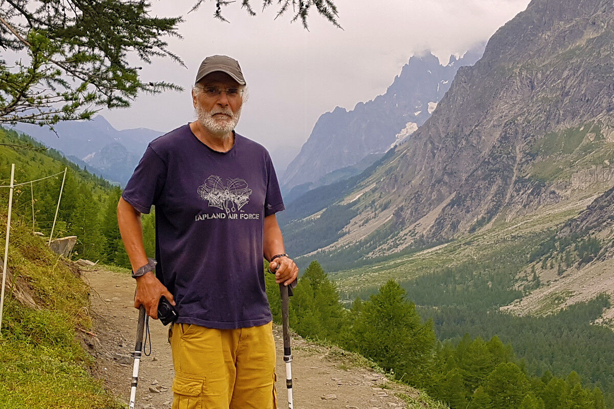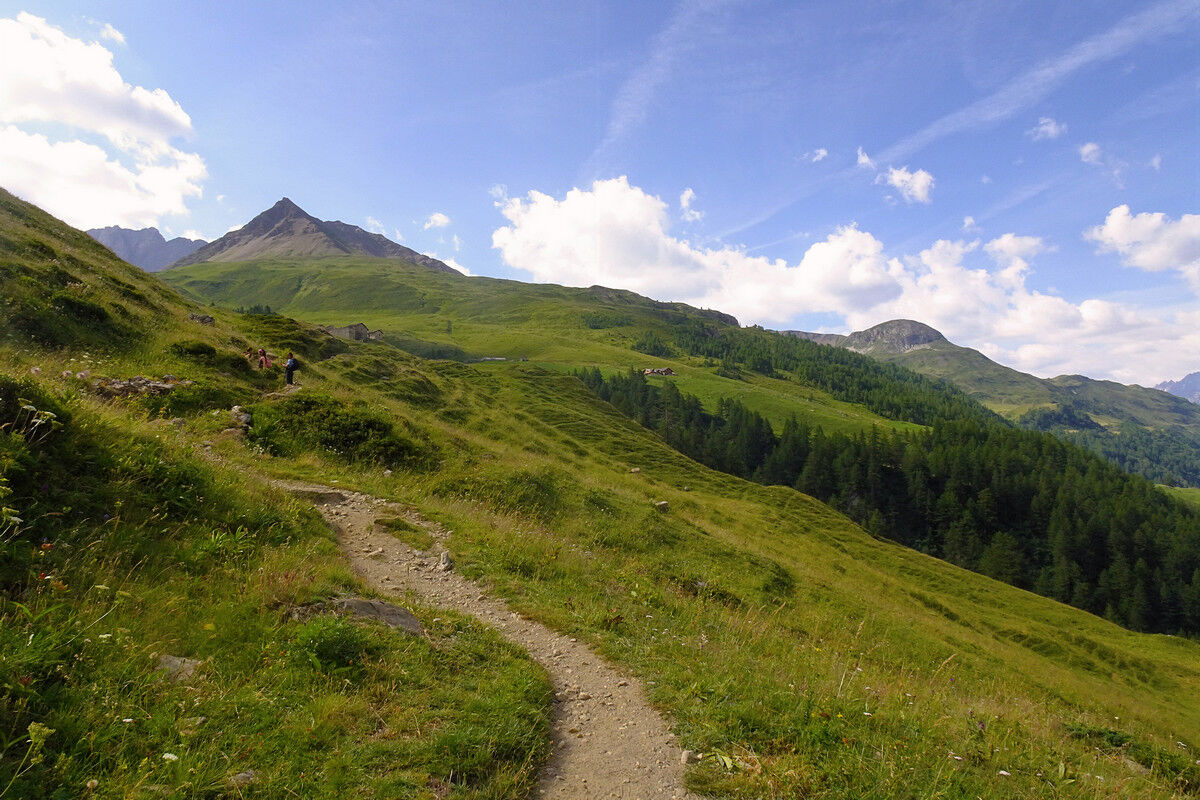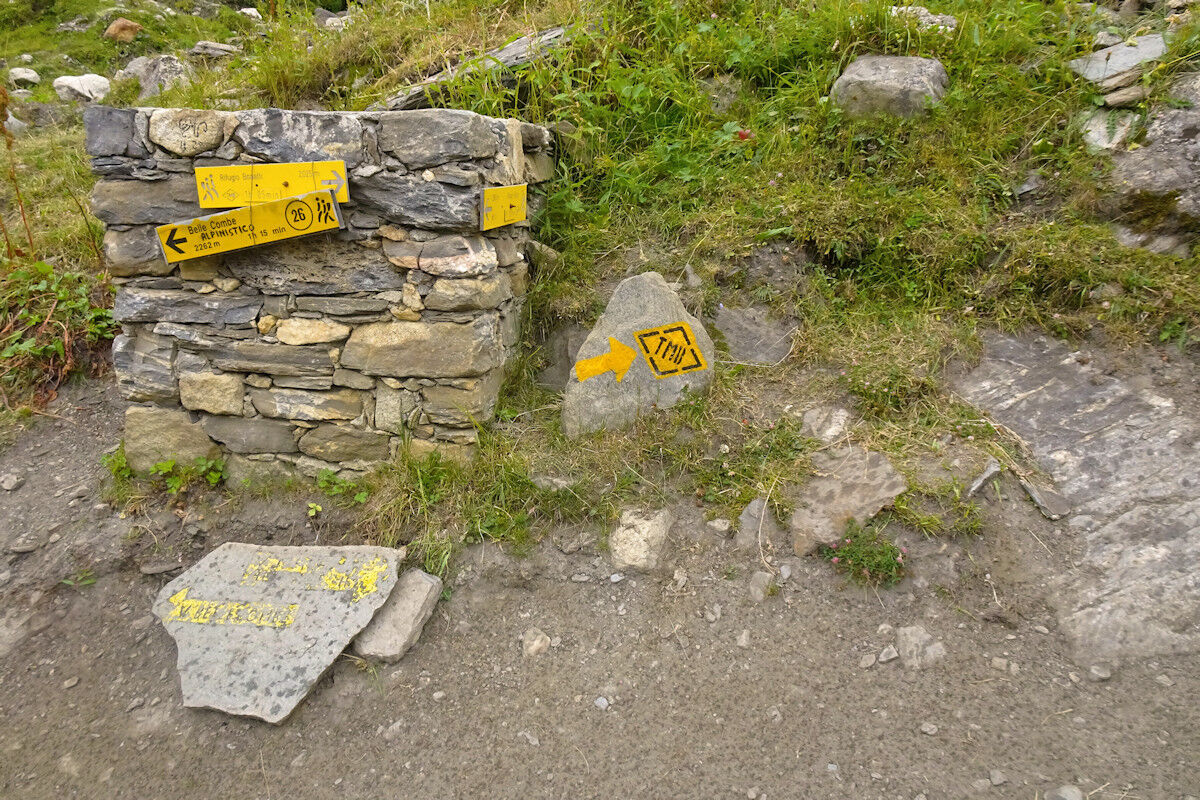 Vom Rifugio Bonatti geht es auf dem TMB, einem Panoramaweg am Südosthang des italienischen Val Ferret, Richtung Nordosten. Auf der ganzen Strecke fasziniert die grandiose Aussicht auf das Mont-Blanc-Massiv auf der gegenüberliegenden Talseite. Dieser Abschnitt der TMB lädt zum Flanieren und Genießen ein. Doch im Westen über Courmayeur verdunkelt sich der Himmel zusehends, ein Gewittergrollen ist zu hören, ein paar Regentropfen lassen uns schneller gehen – aber alles zieht an uns vorbei, das schöne Wetter kehrt zurück.