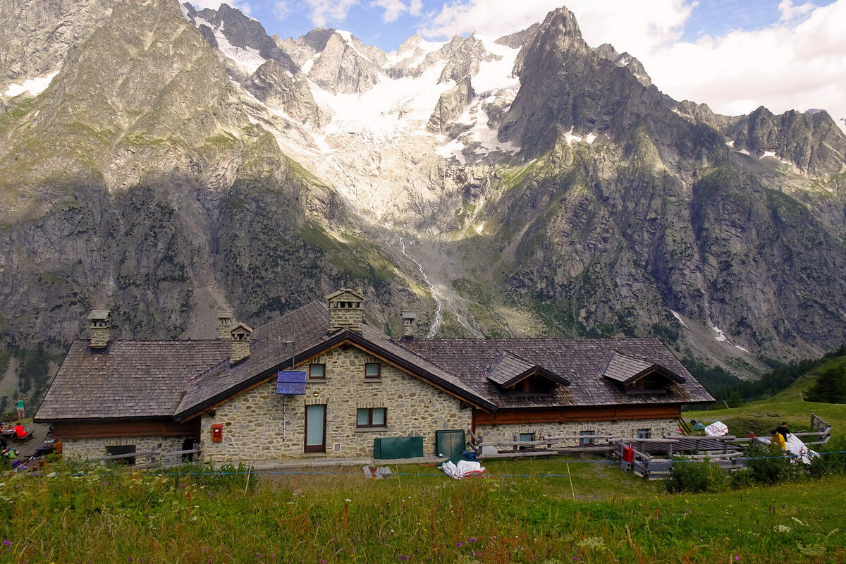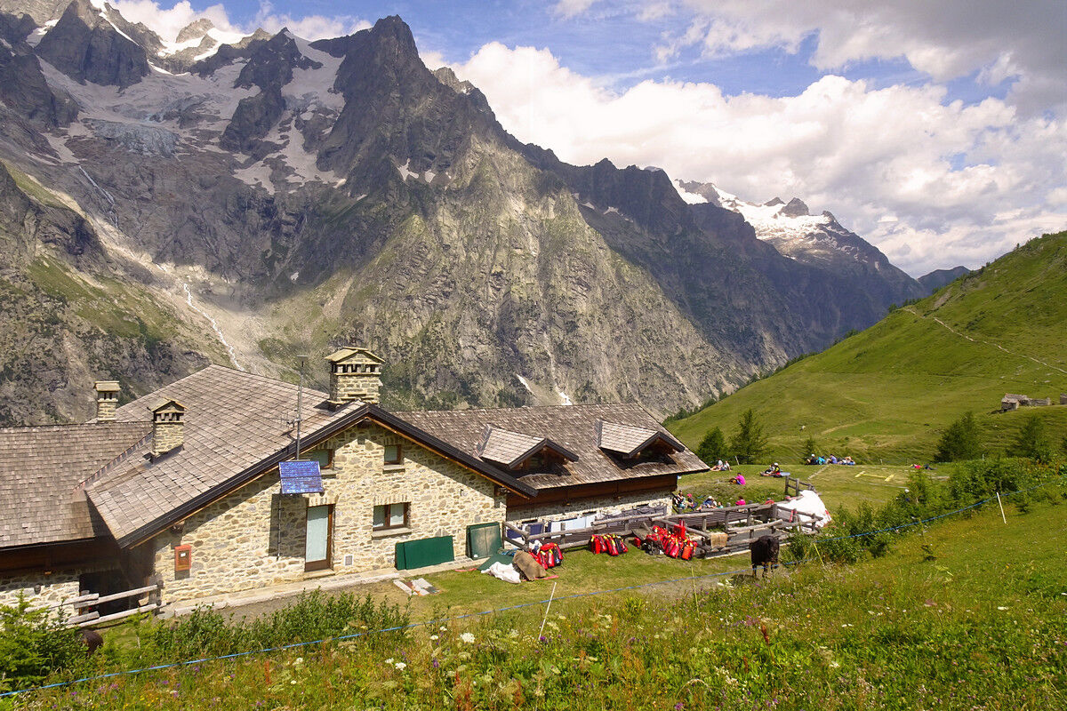 Das Rifugio Walter liegt im Val Ferret auf einer Art Balkon gegenüber dem Mont-Blanc-Massiv und bietet so einen atemberaubenden Blick auf die vergletscherten Gipfel mit dem prächtigen Fréboudze-Gletscher.