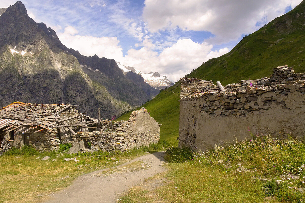 Das italienische Val Ferret begrenzt die östliche Mont-Blanc-Gruppe im Süden. Es wird vom italienisch-französischen Grenzkamm mit Aiguille de Triolet, Aiguille de Talèfre, Aiguille de Leschaux, Grandes Jorasses, Dent du Géant bis auf 2500 m überragt.