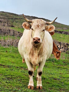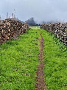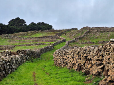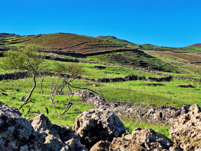 Die Meseta de Nisdafe ist ein Hochplateau im Nordosten von El Hierro, zwischen 900 und 1.200 Metern Höhe, nahe dem Dorf San Andrés. Nach den Regenfällen im Winter zeigen sich die Wiesen und Weiden in sattem Grün, durchzogen von bunten Blüten. Typische Trockenschichtmauern aus Vulkangestein teilen die Fläche in Parzellen, auf denen Kühe, Schafe und Pferde grasen.