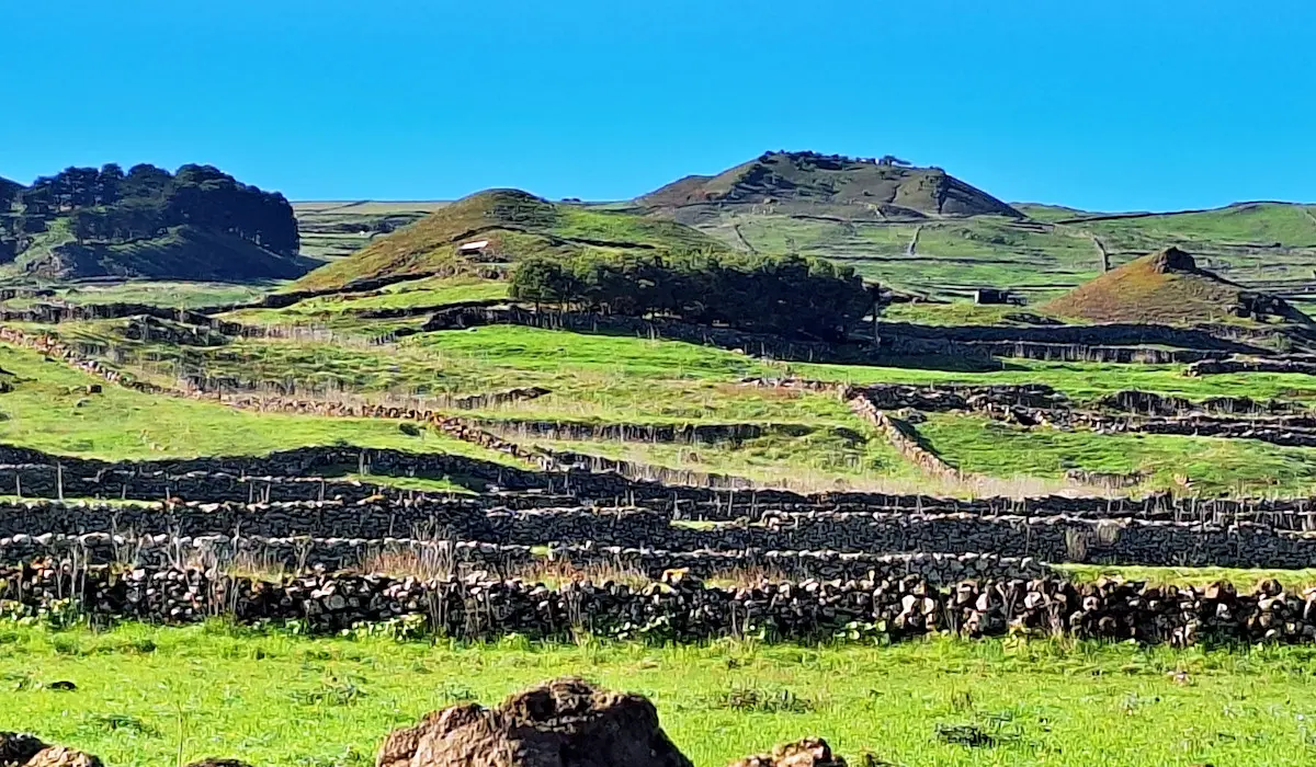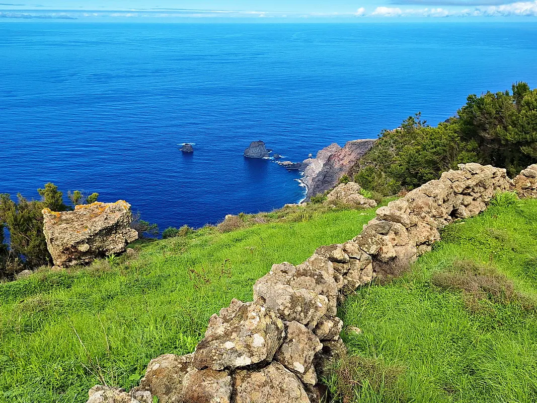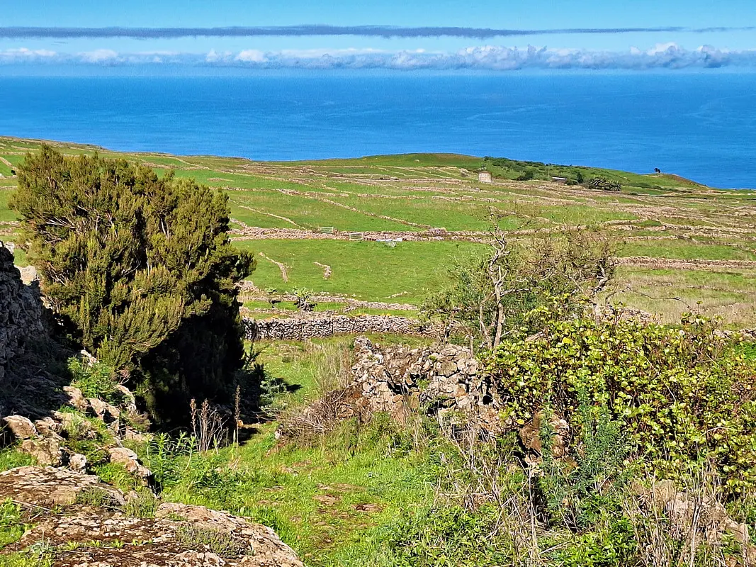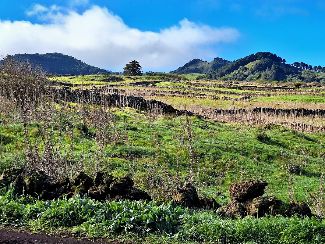 Die Meseta de Nisdafe ist ein Hochplateau im Nordosten von El Hierro, zwischen 900 und 1.200 Metern Höhe, nahe dem Dorf San Andrés. Nach den Regenfällen im Winter zeigen sich die Wiesen und Weiden in sattem Grün, durchzogen von bunten Blüten. Typische Trockenschichtmauern aus Vulkangestein teilen die Fläche in Parzellen, auf denen Kühe, Schafe und Pferde grasen.