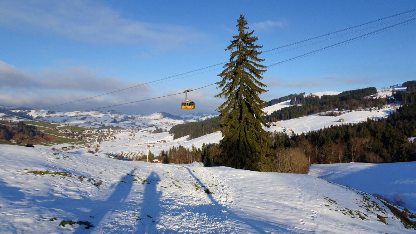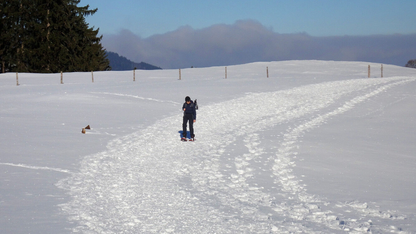Am Bodensee herrscht trüber Nebel, aber im Appenzellerland scheint die Sonne und verzaubert die verschneiten Berge. Also packen wir die Schneeschuhe ein und machen uns auf eine gemütliche Runde bei Jakobsbad, unterhalb des Kronbergs. Unterwegs genießen wir die Blicke über das verschneite Appenzellerland.