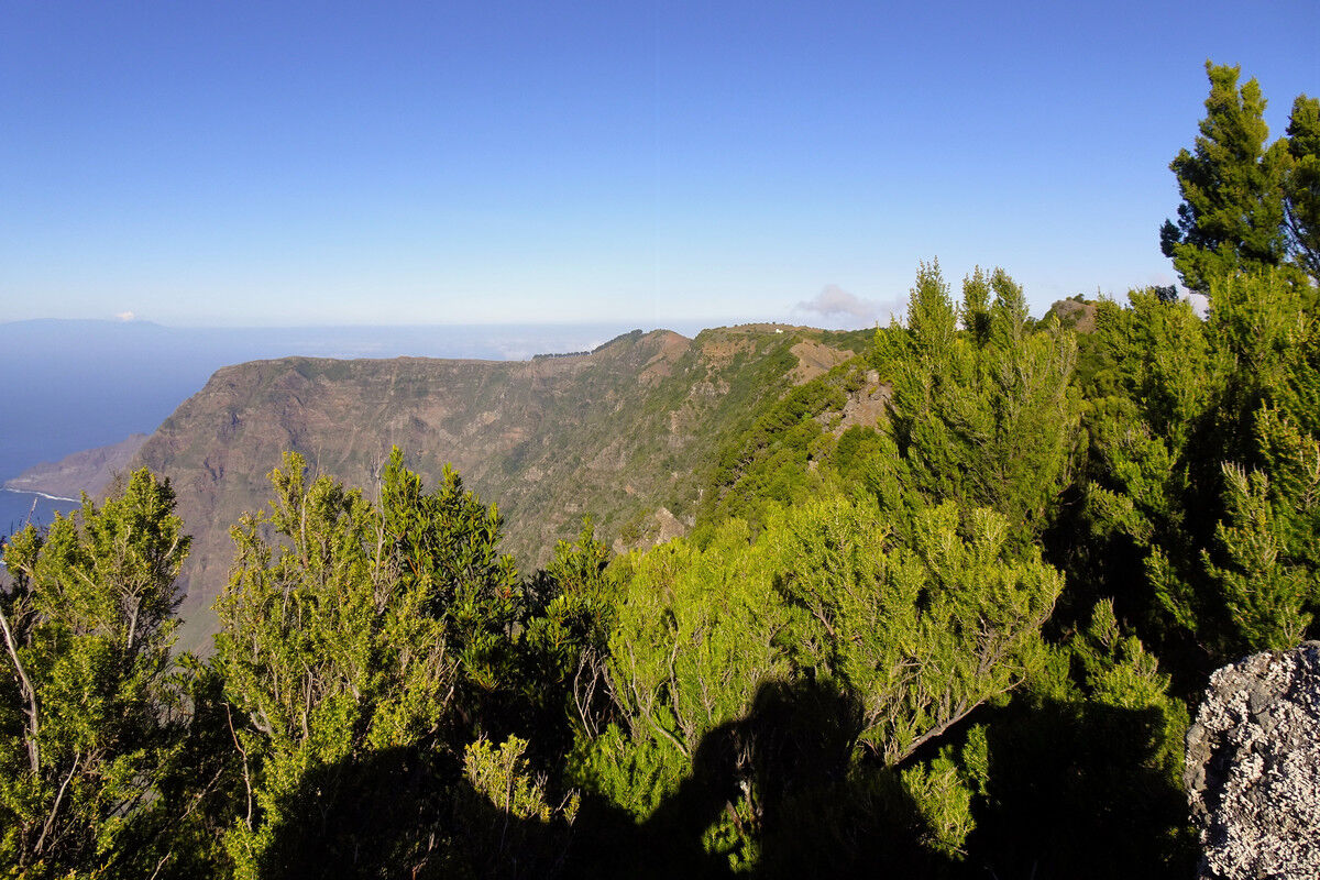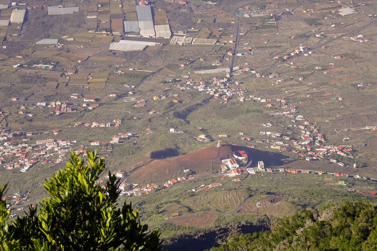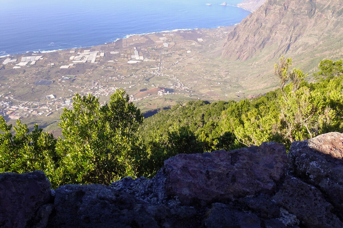 Dieser Aussichtspunkt ist ein natürlicher Balkon über dem Tal von El Golfo. An den Felswänden unterhalb des Aussichtspunktes erheben sich die Ausläufer des Lorbeerwaldes. Die Felswände entstanden durch einen gewaltigen Erdrutsch, bei dem ein Teil von El Hierro ins Meer stürzte. Das Golfo-Tal ist das Ergebnis dieses Einsturzes. Links ist der Vulkan Tanganasoga (1.384 m) zu sehen – immerhin die vierthöchste Erhebung der Insel.