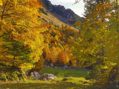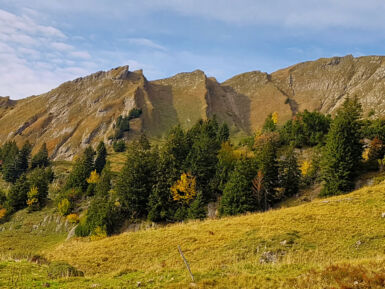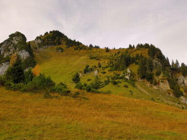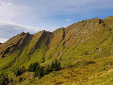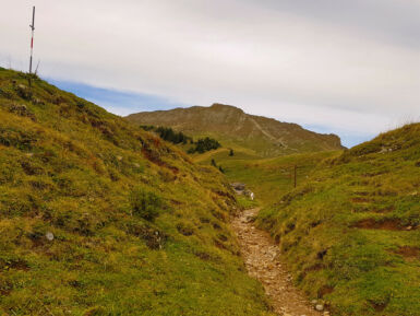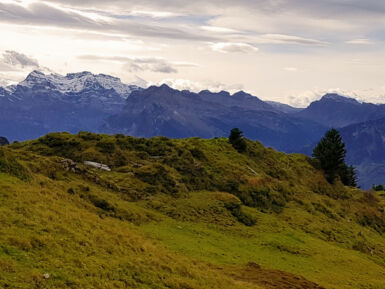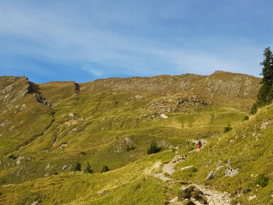 Parallel zur Sesselbahn wandern wir hinauf nach Niederschlag und weiter in östlicher Richtung über die Alpweiden des Strichbodens und vorbei an der Gäudighütte zur Hinteren Höhi. Die eindrückliche Hochmoorlandschaft mit den zahlreichen prächtigen Legföhren ist ein Genuss! Bald wendet sich der Weg nach Westen und führt auf der Nordseite des Mattstocks über die Alp Vordermatt zur Alp Oberchäseren.