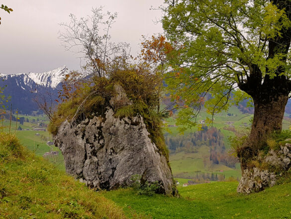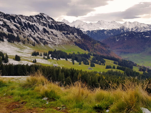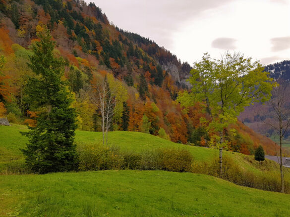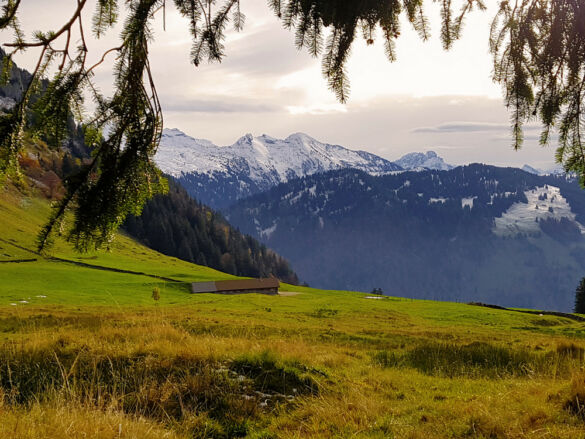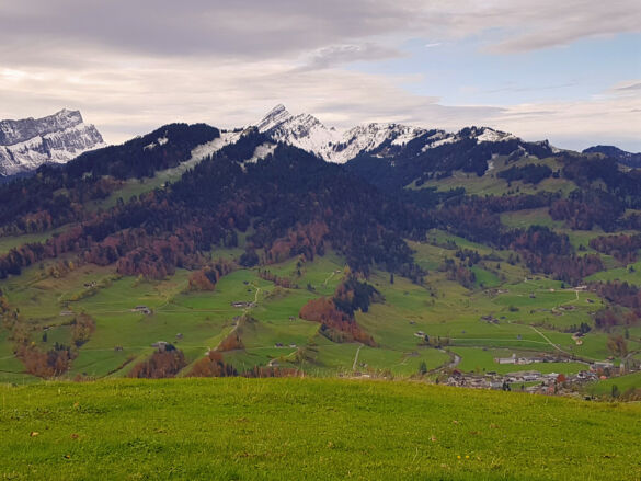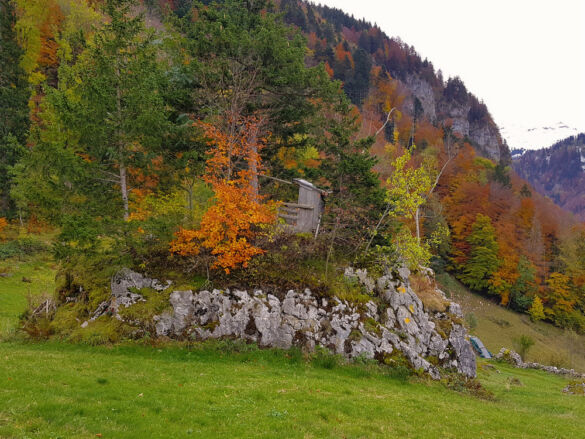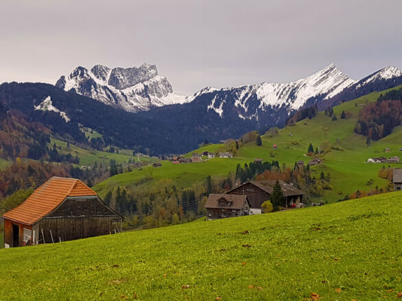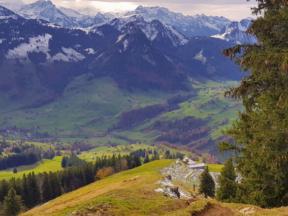 Um eine Rundwanderung zu machen, nehmen wir den Abstieg über den Risipass (1.459 m). Vorbei an Ahorn und Rueboden führt der Weg steil hinunter zu Hütten und weiter auf dem bekannten Strässchen zur Thur.
