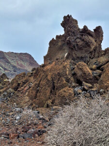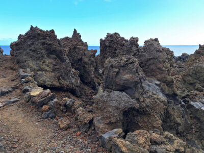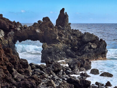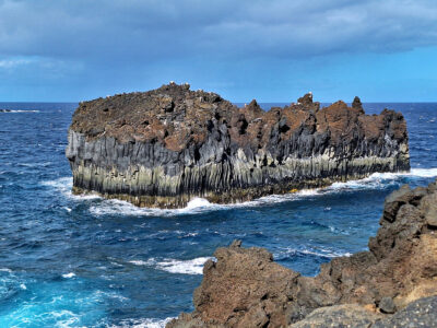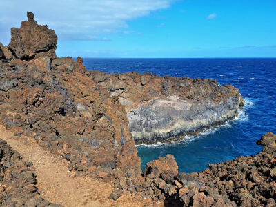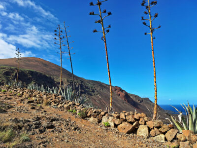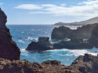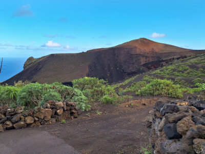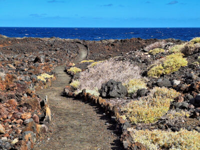 Diese Wanderung verbindet die Hauptstadt von El Hierro mit der wilden Lavaküste im Norden der Insel. Ausgangspunkt ist Valverde, von wo der Weg stetig bergab durch den Nordhang der Insel führt. Als Teil des gut ausgeschilderten GR-131 verläuft die Route bis zum Strand von Tamaduste. Es folgt eine leichte Wanderung entlang der Lavaküste zum Mirador Roque de las Gaviotas, dem Mövenfelsen. Vor der Küste ragt der markante Felsen mit sechseckigen Basaltklippen aus dem Meer, dazu kommen eindrucksvolle Felsbögen entlang der rauen Küstenlinie. Der Rückweg führt steil durch die Lavagrushänge des Vulkans La Cancela, dessen Flanke mit herrlichem Tiefblick auf Tamaduste gequert wird. Durch ein wildromantisches, von Flechten überzogenes Lavafeld und vorbei an Weinbergen schließt sich der Rundweg schließlich wieder in Valverde.