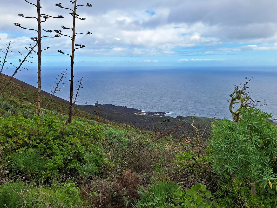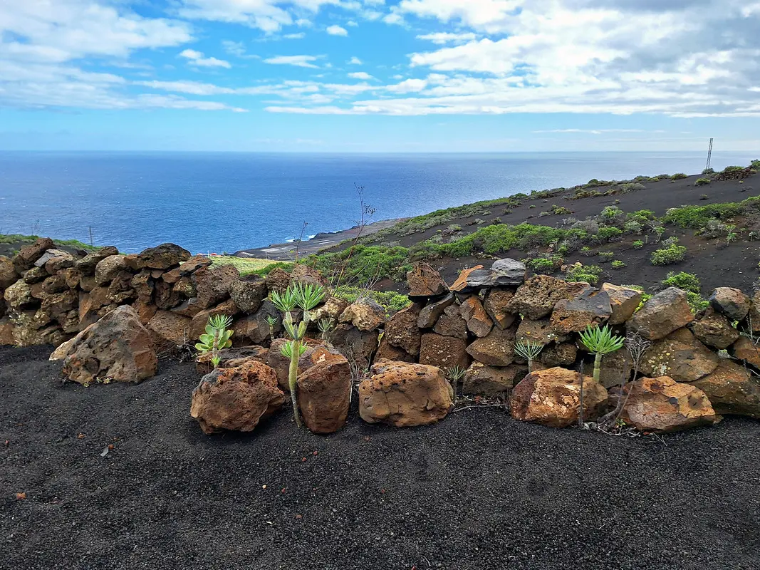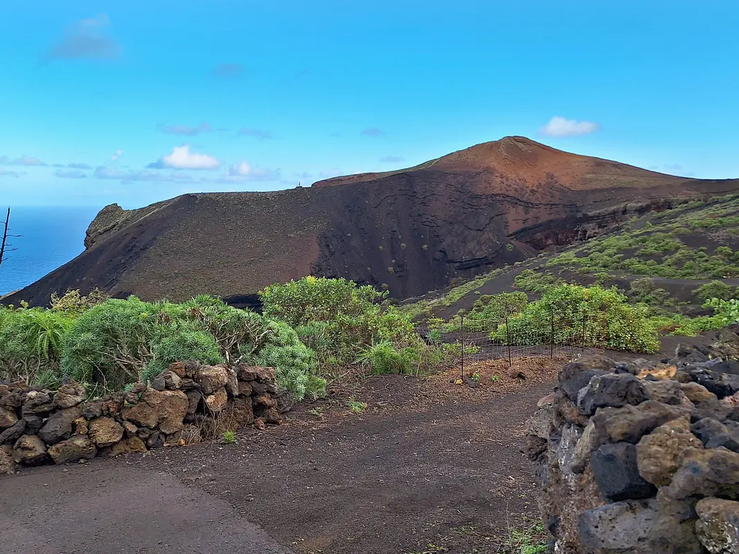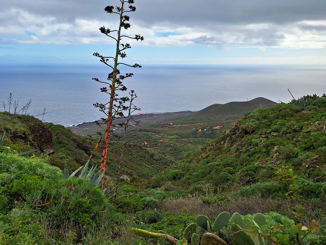 Diese Wanderung verbindet die Hauptstadt von El Hierro mit der wilden Lavaküste im Norden der Insel. Ausgangspunkt ist Valverde, von wo der Weg stetig bergab durch den Nordhang der Insel führt. Als Teil des gut ausgeschilderten GR-131 verläuft die Route bis zum Strand von Tamaduste. Es folgt eine leichte Wanderung entlang der Lavaküste zum Mirador Roque de las Gaviotas, dem Mövenfelsen. Vor der Küste ragt der markante Felsen mit sechseckigen Basaltklippen aus dem Meer, dazu kommen eindrucksvolle Felsbögen entlang der rauen Küstenlinie. Der Rückweg führt steil durch die Lavagrushänge des Vulkans La Cancela, dessen Flanke mit herrlichem Tiefblick auf Tamaduste gequert wird. Durch ein wildromantisches, von Flechten überzogenes Lavafeld und vorbei an Weinbergen schließt sich der Rundweg schließlich wieder in Valverde.