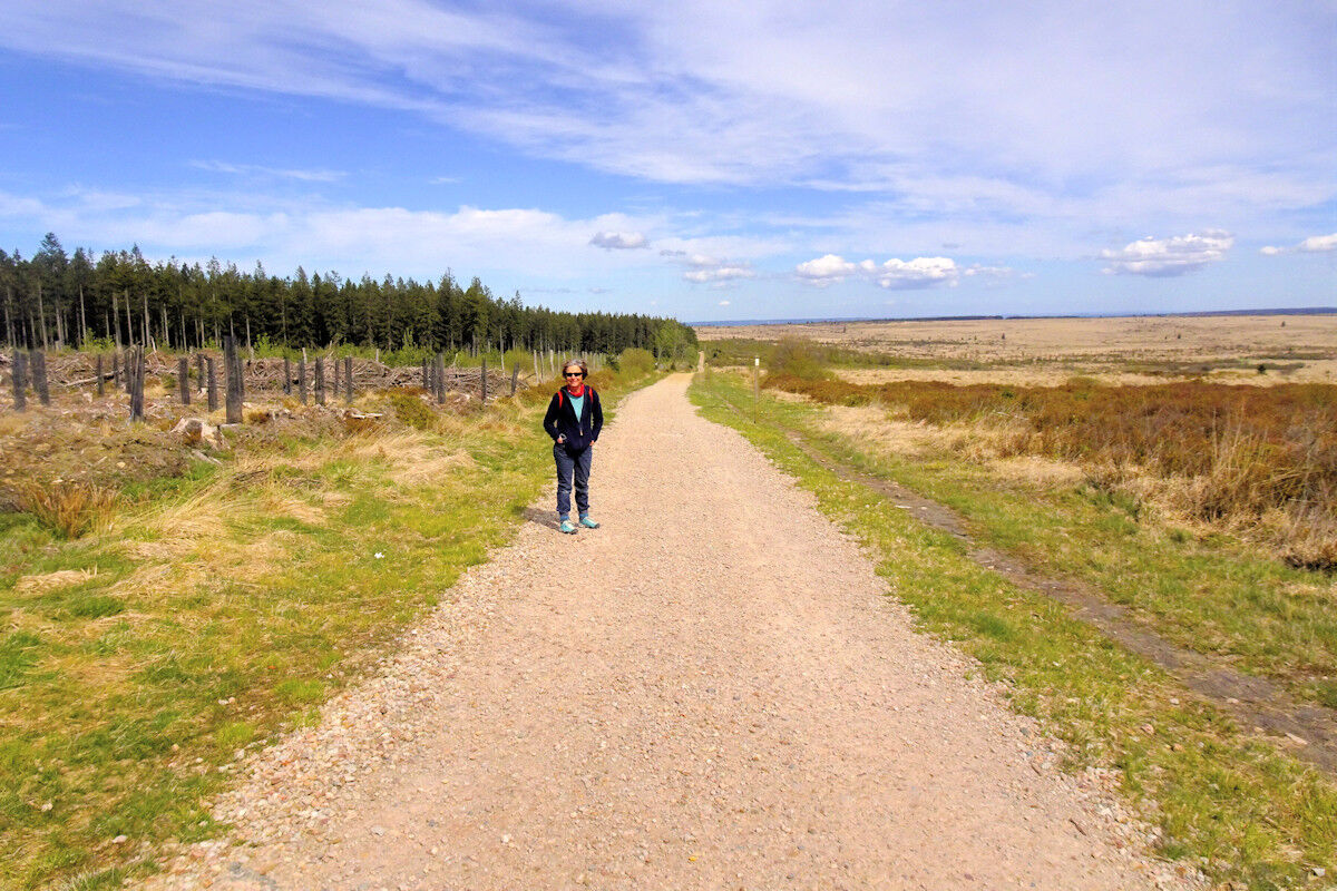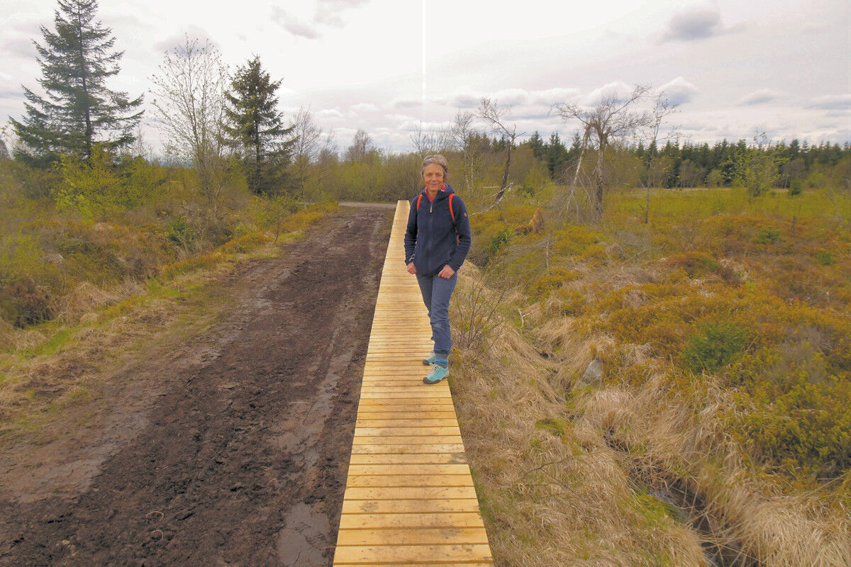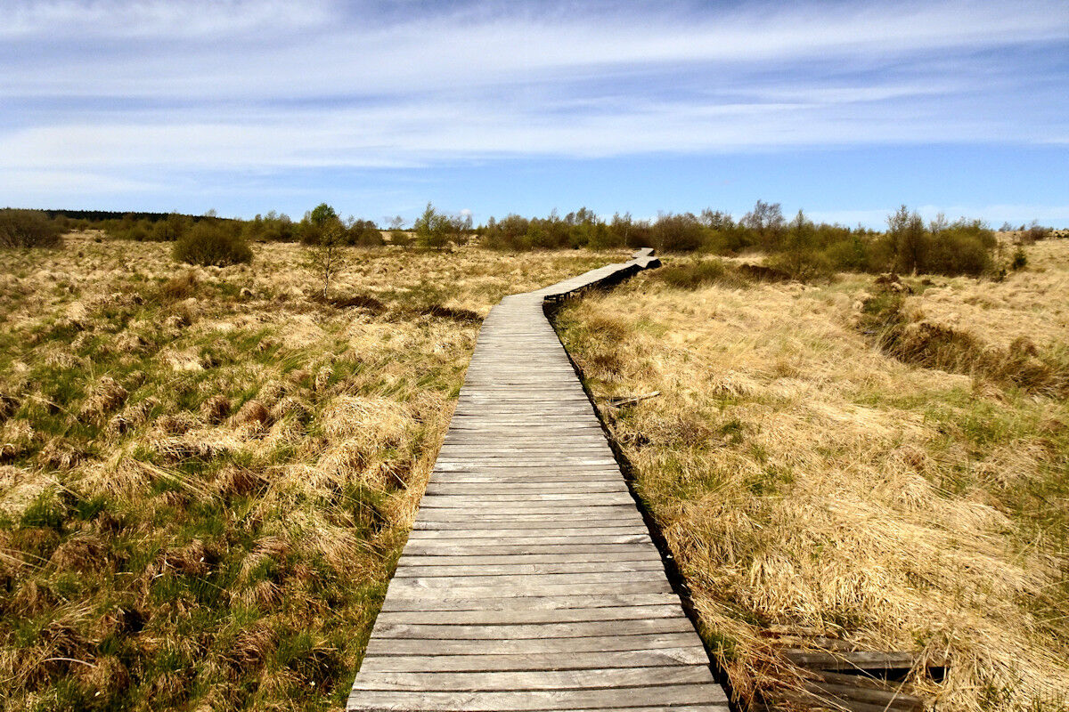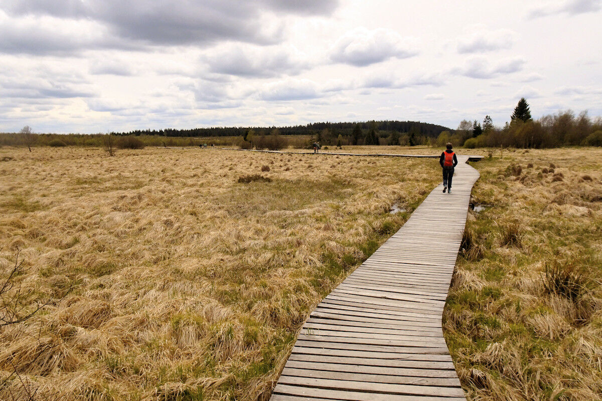 Dann überqueren wir den großen Parkplatz am Signal de Botrange und die Hauptstraße und wandern zu einer Aussichtsplattform im Wallonischen Venn. Hier genießen wir einen unglaublichen Weitblick über die Heide- und Moorlandschaft. Von hier aus schlängelt sich ein Pfad entlang der Venn-Ebene. Immer wieder müssen wir die Holzstege benutzen, die auf Pfählen über dem Moor schweben. Am Hillbach sind wir mitten im Nirgendwo, im Herzen des Naturschutzgebietes. Was für eine Weite!