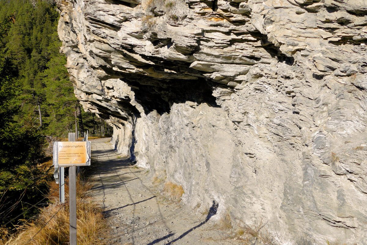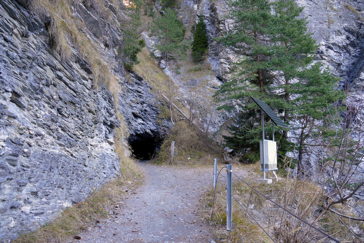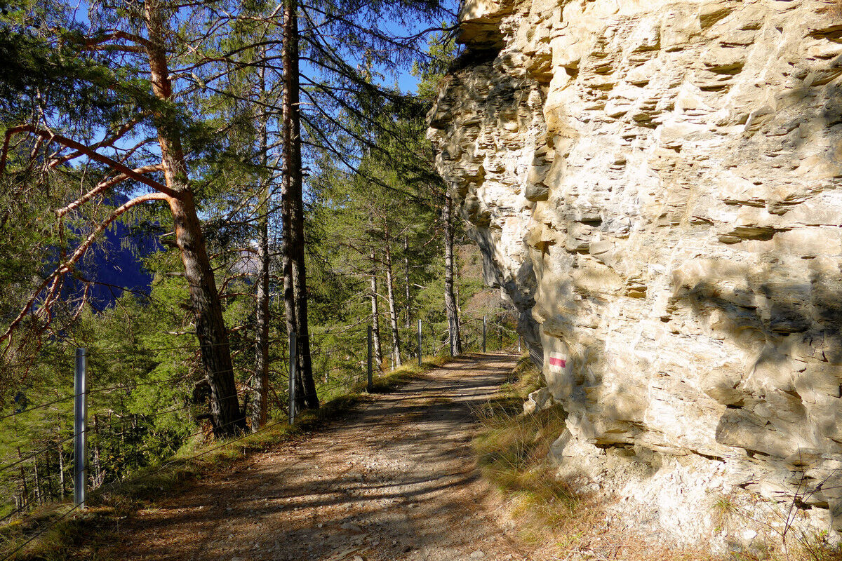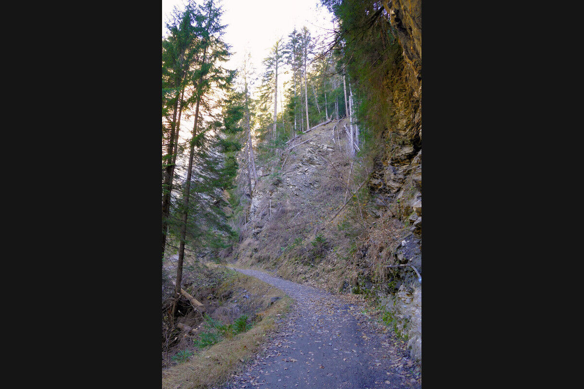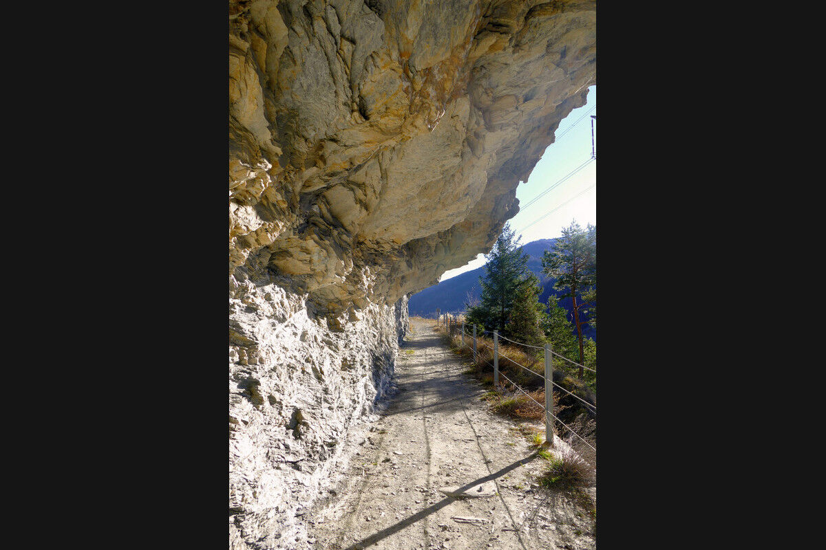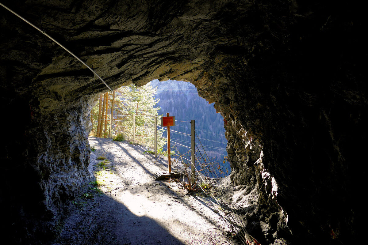 Dann geht es auf einer schmalen und steilen Straße hinauf nach Muldain (1.200 m). Am Ortsende lasse ich das Auto stehen und wandere auf dem breiten Schyn-Weg etwas absteigend zu der vorgeschobenen Kuppe Pleuna (1.166 m) mit Kapelle und Kreuz. Nun führt der Weg steiler abwärts, oberhalb von felsigen Abbrüchen mit schönen Ausblicken in das Albulatal. Nach diesem kurzem Höhenverlust wandere ich fast eben weiter über die steilen Hänge und durch die tief eingeschnittenen Bachschluchten. Dann folgt die steinschlaggefährdete Passage, ein Wegstück mit Felsdach, und kurz danach schon der beleuchtete Tunnel. Das letzte Wegstück bringt mich steil abwärts zur Lichtung Plan Funtauna (995 m) mit einem besonders schönen Rastplatz.