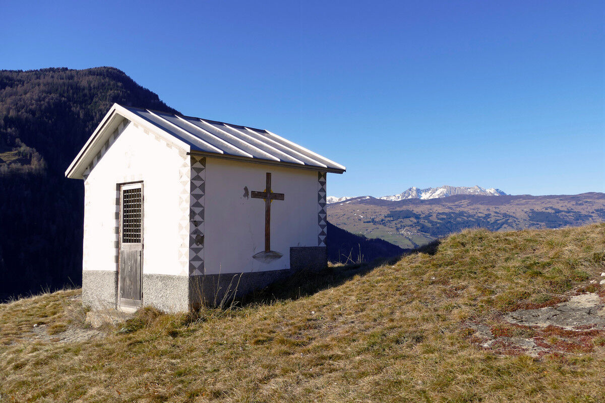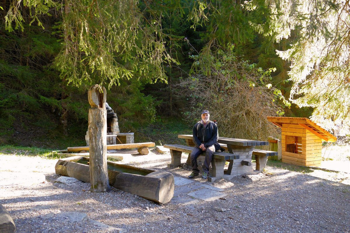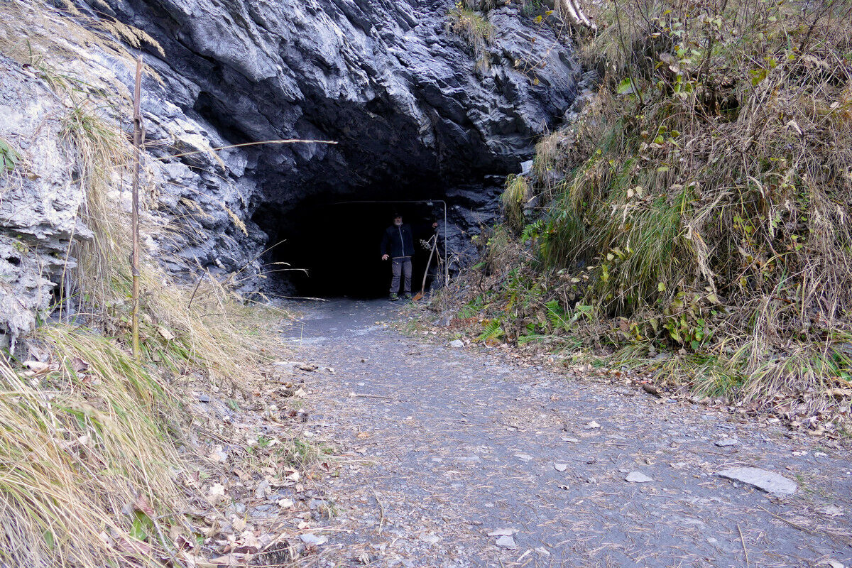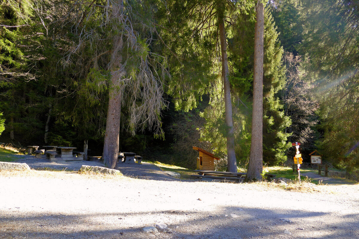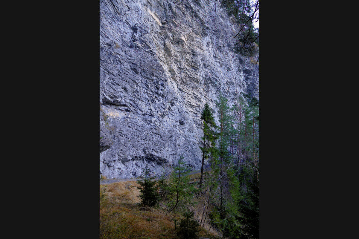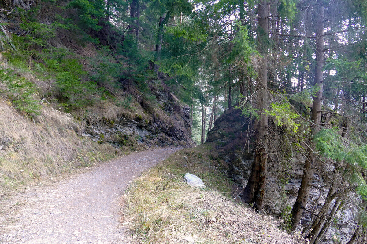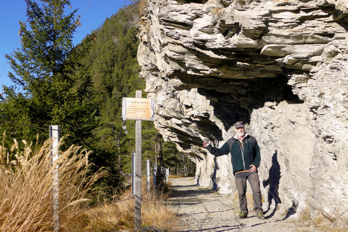 Dann geht es auf einer schmalen und steilen Straße hinauf nach Muldain (1.200 m). Am Ortsende lasse ich das Auto stehen und wandere auf dem breiten Schyn-Weg etwas absteigend zu der vorgeschobenen Kuppe Pleuna (1.166 m) mit Kapelle und Kreuz. Nun führt der Weg steiler abwärts, oberhalb von felsigen Abbrüchen mit schönen Ausblicken in das Albulatal. Nach diesem kurzem Höhenverlust wandere ich fast eben weiter über die steilen Hänge und durch die tief eingeschnittenen Bachschluchten. Dann folgt die steinschlaggefährdete Passage, ein Wegstück mit Felsdach, und kurz danach schon der beleuchtete Tunnel. Das letzte Wegstück bringt mich steil abwärts zur Lichtung Plan Funtauna (995 m) mit einem besonders schönen Rastplatz.