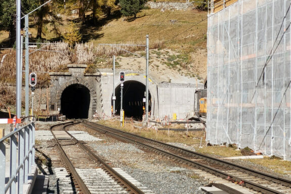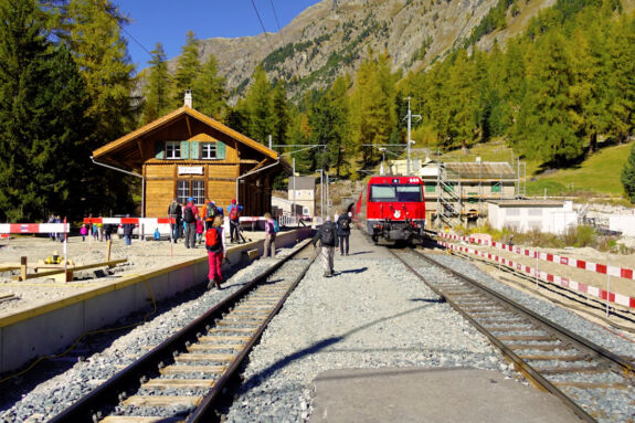 Spinas besteht eigentlich nur aus dem Bahnhof der rhätischen Bahn und einem Gasthaus und liegt direkt am Südportal des Albulatunnels. Leider hält hier nur alle zwei Stunden ein RhB-Zug, und bei der Fahrt von Morteratsch müssen wir zweimal, in Pontresina und Samedan umsteigen. Doch wie bei der RhB gewohnt klappt alles ohne Verspätungen und wir kommen bei schönstem Wetter im Val Bever an. Auf Grund der Bauarbeiten für den neuen RhB-Albulatunnel, der Mitte 2024 in Betrieb gehen soll, ist in Spinas reger Betrieb.