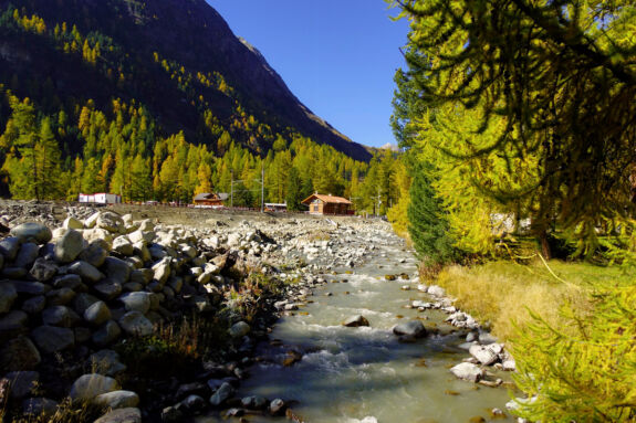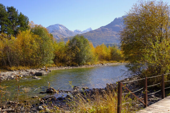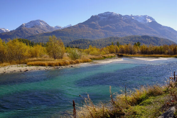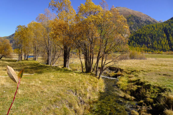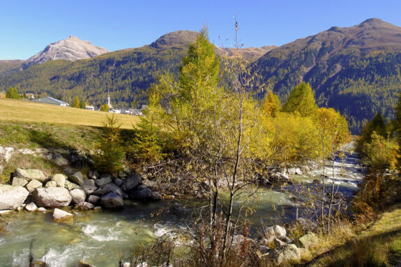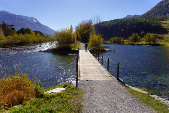 Ohne große Schwierigkeiten erreichen wir nach knapp vier Kilometer den Ortsrand von Bever, umgehen jedoch den Dorfkern und kommen so in die weite Hochebene des Oberengadins und zum Inn. Nun wandern wir bequem und in aller Ruhe dem Inn entlang und durch das reizvolle Naturreservat südlich von Samedan, dass durch die Renaturierung der beiden Flüsse Flaz und Inn entstanden ist.