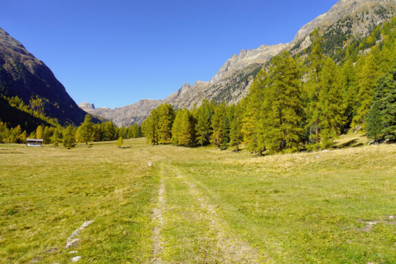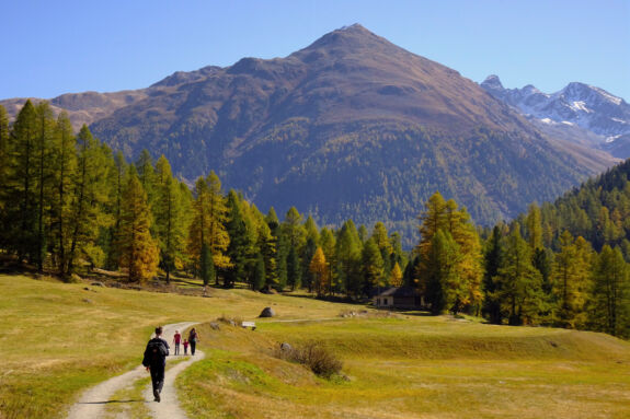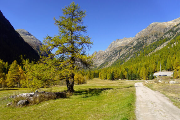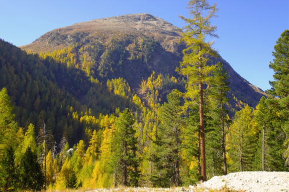 Von Spinas aus können zwei Wege aus dem Val Bever hinaus gegangen werden. Ein breiter Fahrweg führt direkt, auf der rechten Talseite, unmittelbar neben der Bahnlinie entlang – nicht unbedingt zu empfehlen solange in Spinas noch gebaut wird. Wir folgen dem Wald- und Wiesenpfad auf der gegenüberliegenden Talseite, mit etwas größerem Abstand zur Bahnlinie. Der Weg durch schönsten Lärchen- und Arvenwald ist besonders heute mit seinen Herbstfarben besonders reizvoll.