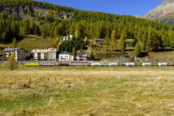 Dann verlässt der Weg den Inn, wir überqueren bei einem unbewachten Bahnübergang die Gleise der Albulabahn und passieren den Bahnhof von Celerina. Bergseits der Bahnlinie führt uns der markierte Weg vorbei an der Skeletonbahn hinauf nach St. Moritz.