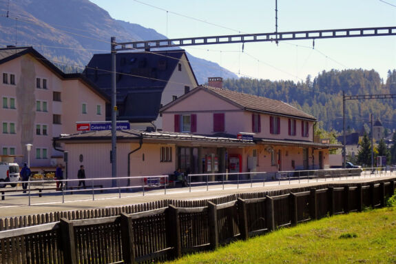 Durch das Ortszentrum von St. Moritz wandern wir weiter zum Bahnhof hinunter, vorbei an teuren Läden und Hotels. Vom großen Endbahnhof der Rhätischen Bahn genießen wir den Blick auf den Lej da San Murezzan und auf das südwestliche Oberengadin, welches mit einer Bahnlinie nach Chiavenna hätte erschlossen werden sollen.