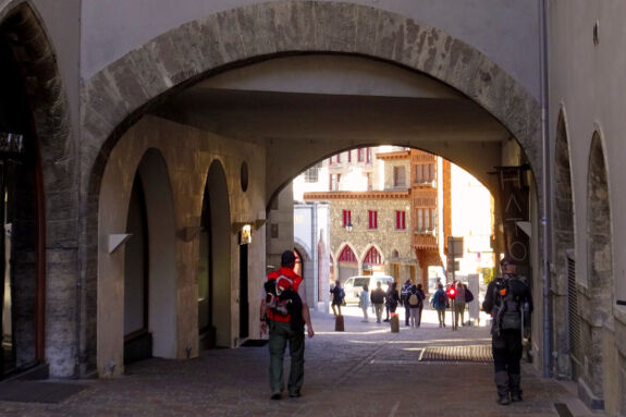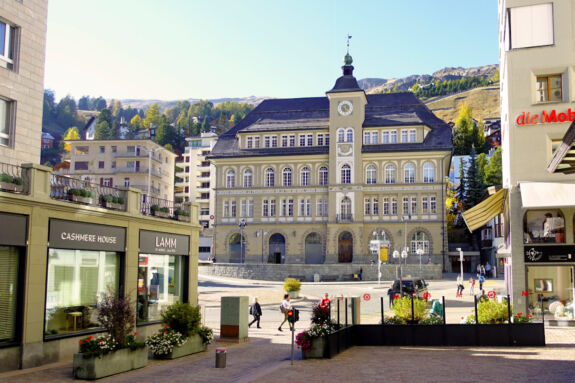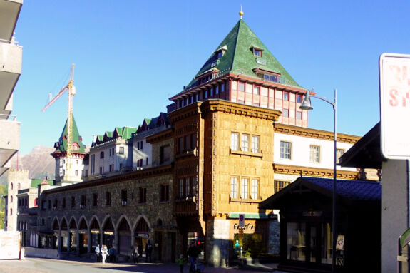 Nur wenige Meter gehen wir auf der Via Maistra und schon beeindruckt uns der Schiefe Turm von St. Moritz. Der ehemalige Kirchturm gehört zu den Wahrzeichen von St. Moritz, er ist ein Überrest der 1893 abgerissenen St-Mauritius-Kirche. Durch einen Hangrutsch begann sich Ende des 18. Jahrhunderts der Kirchturm zu verschieben, nur durch aufwendige und wiederholte Sicherungsmaßnahmen konnte ein Umkippen verhindert werden. Heute hat er einen Neigungswinkel von 5,5°.