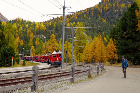 Nun folgt der für uns schönste Teil dieser Etappe. Auf einem angenehmen Wanderweg, durch einen lichten, herbstbunten Arven- und Lärchenwald Wald erreichen wir, immer von der Berninabahn begleitet, die Station Morteratsch. Dahinter ragen im blauen Himmel hoch die weisen Gipfel des Berninamassivs auf.