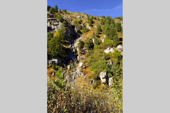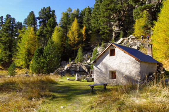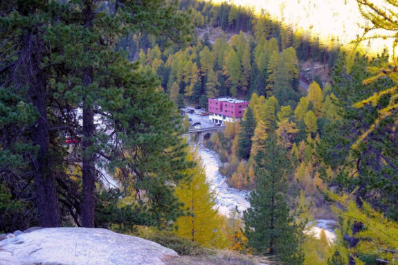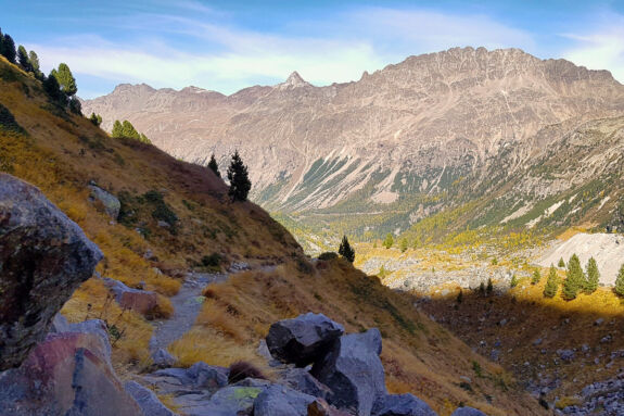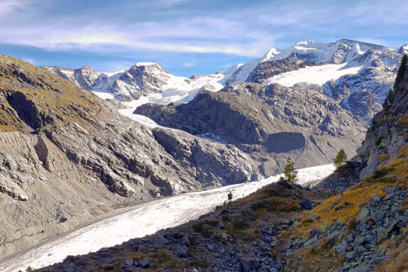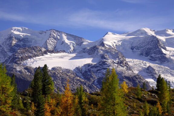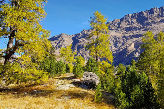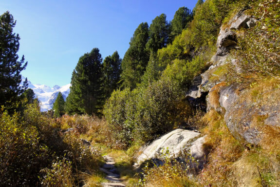 Nach der Station Morteratsch windet sich für kurze Zeit ein bequemer Pfad durch den herbstbunten Arvenwald, vorbei an charakteristischen Gletscherschliffplatten. Dann zweigt der Hüttenzustieg ab und führt über Wurzeln und Blöcke durch den Wald hinauf. Bei einer Abzweigung nehmen wir den Stichweges, der etwas rau über Blöcke zum Aussichtspunkt Chünetta führt. hier bietet sich ein einmaliges Gipfelpanorama, angefangen mit dem Morteratschgletscher bis zum Piz Boval. Ganz leicht erkennen wir auch den Piz Bernina, mit 4.049 m der einzige Viertausender der Ostalpen. Gerade im Herbst ist der Kontrast zwischen blauem Himmel, weißem Schnee und dem buntem Blätterwerk einmalig schön.