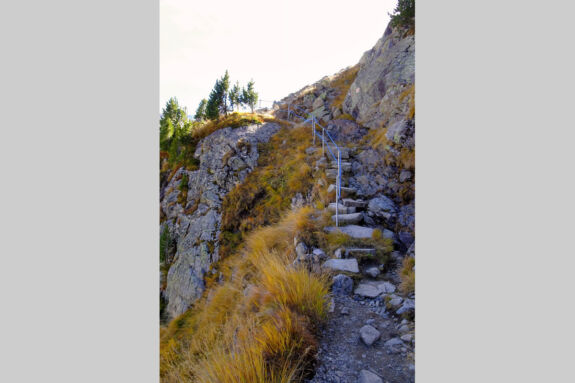 Wieder auf dem Hauptweg angekommen wandern wir auf dem gleichmäßig ansteigenden Hüttenzustieg immer weiter entlang, es gibt nun keine Wegverzweigung bis zur Bovalhütte mehr. Der Wanderweg führt größtenteils durch den schönen Wald und entlang der Seitenmoräne des Vadret da Morteratsch mit tollem Ausblick auf die Gletscherzunge. Kurz vor der Hütte sind einige kurze Felsstufen mit Seilversicherungen versehen, die eine gewisse Trittsicherhet erfordern. Dann kommt auch schon der Schlusshang zur Hütte.