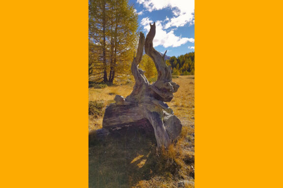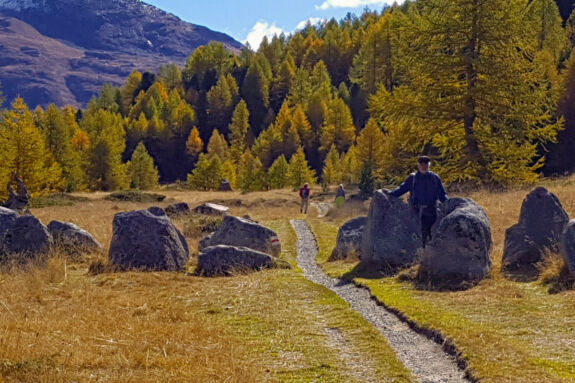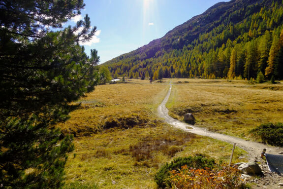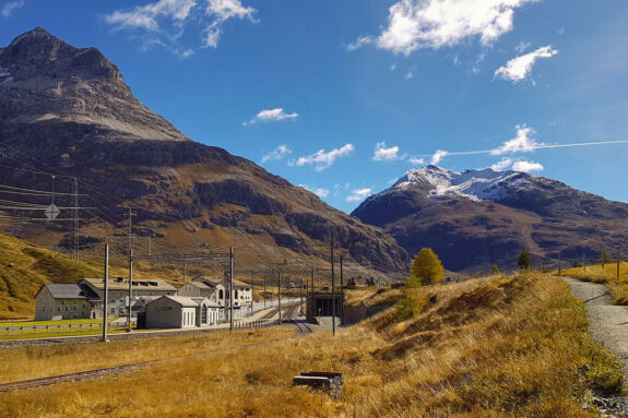 Nach dem Wasserfallweg erleben wir noch ein Stück den mit Heidelbeerstauden durchsetzten herbstbunten Arven- und Lärchenwald und gelangen so hinauf zur Hochebene von Bernina Suot. Das nun baumlose Tal gibt die Sicht frei auf die umliegenden Drei- bis Viertausender mit ihren Gletschern und auf die beiden Luftseilbahnen Diavolezza und Lagalb. Wir genießen den leichten Anstieg auf der Via Albula/Bernina bzw. Via Valtellina. Stets im Blickfeld haben wir dabei auch die Berninabahn.