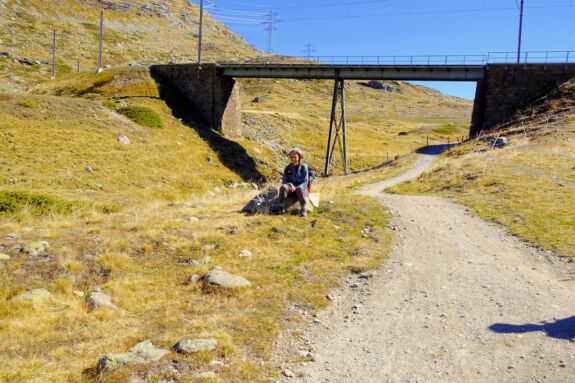 Diese Etappe führt hoch zum zweiten Pass der Via Albula/Bernina, zum 2.330 m hohen Berninapass, genauer zum ein wenig tiefer gelegenen Bahnhof der rhätischen Bahn Ospizio Bernina (2.253 m). Nach der Überwindung einer 120-m-Geländestufe auf dem Wasserfallweg verläuft die Via Albula/Bernina durch ein breites Tal, das eher wie eine Hochebene wirkt, sanft aufwärts. Steter Begleiter dabei sind die roten Züge der räthischen Bahn und die gletscherbedeckten Gipfel der Berninagruppe.