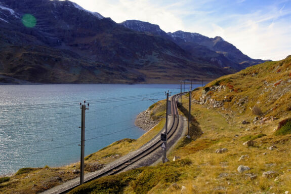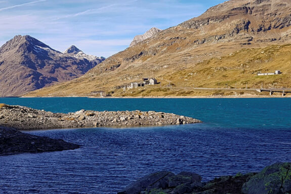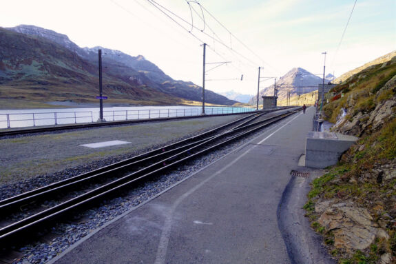Die Via Albula/Bernina verläuft ab hier entlang des östliche Ufers zu unserem Tagesziel, dem Ospizio Bernina, in Sichtweite ca. 50 Meter über dem Wasserspiegel des Sees gelegen.