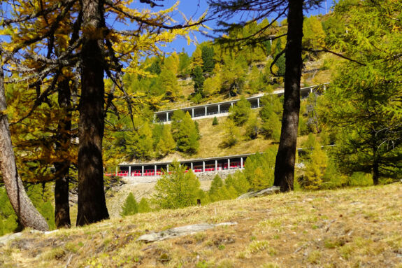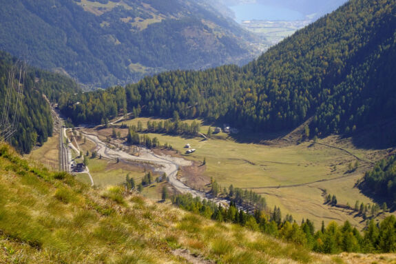 Nun sind es nur noch wenige Minuten bis zu unserem ersten Zwischenziel, der Alp Grüm, den Bahnhof können wir von unten schon sehen. Ein nun guter Weg führt uns in drei Spitzkehren nach oben, zunächst vorbei am Kraftwerk Palü, dann über die Bahngleise der rhätischen Bahn. Etwas erhöht über dem Bahnhof finden wir eine Bank für eine längere Rast. Hier haben wir einen tollen Blick auf die Bahnanlage mit ihrer 180°-Schleife, hinab in das Puschlav bis in die Ferne zum Veltlin mit den italienischen Bergen.