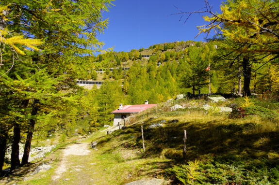 Von hier aus können wir unserer erstes Ziel vor und hoch über uns deutlich erkennen: die Alp Grüm.