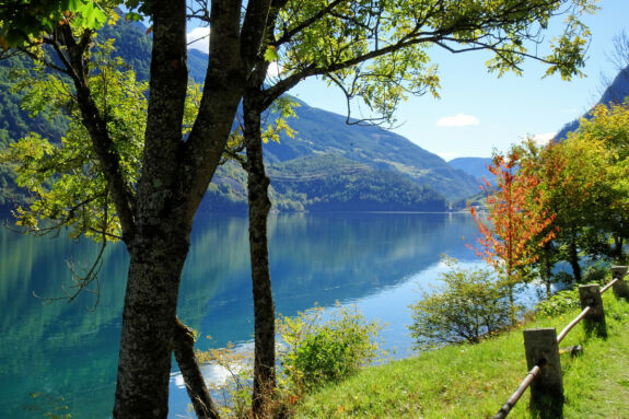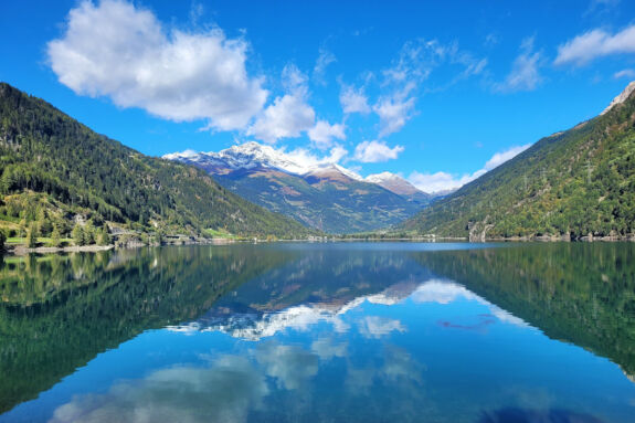 Unser Tag beginnt mit einem gemütlichen Frühstück und anschließend mit einer langen und schönen Zugfahrt mit der Rhätischen Bahn von Morteratsch über den Berninapass an den Lago di Poschiavo. Hier in Le Prese startet dann unsere Wanderung auf der Trasse der alten Kantonsstraße, die seit dem Neubau der Straße als Rad- und Wanderweg freigegeben ist. Zwischen See und Bahnlinie wandern wir gemütlich und erreichen nach knapp drei Kilometern Miralago am südlichen Ende des Sees. Der Blick zurück über den See gibt ein tolles Panorama auf den oberen Teil des Puschlavs frei. Auf der linken Talseite thront auf einem fast überhängenden Felskopf, mehr als 800 Meter hoch über dem See, die Kirche San Romerio.