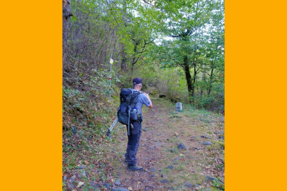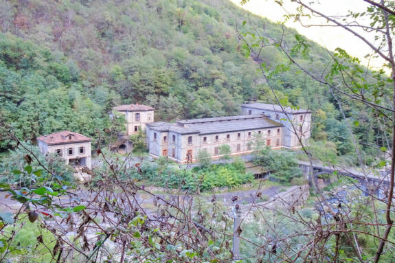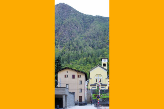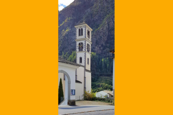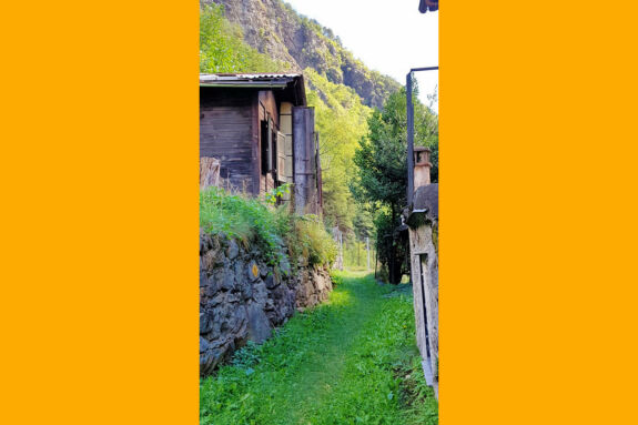 Mitten im Dorf geht es über die Bahngleise, einige Treppenstufen hoch und wir stehen vor der Kirche. Die Druckleitung des Wasserkraftwerkes müssen wir übersteigen, dann erreichen wir einen schmalen Pfad. Auf diesem leicht ruppigen Pfad durchqueren wir einen schönen Kastanienbaumwald und verfallene Bewirtschaftungsterrassen. Mitten im Wald stehen wir plötzlich vor einem unscheinbaren Grenzstein – wir passieren die Grenze nach Italien.