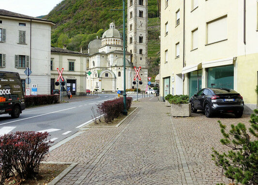 Ein steiler, treppenartiger Fußweg durch einige der höchstgelegenen Weinberge im Veltlin bringt uns auf teilweise in Fels geschlagenen Stufen hinunter zur barocken Basilika Madonna di Tirano. Seit 1908 rumpelt hier die Berninabahn als Straßenbahn über den Platz – allerdings auf der Rückseite der Kirche.