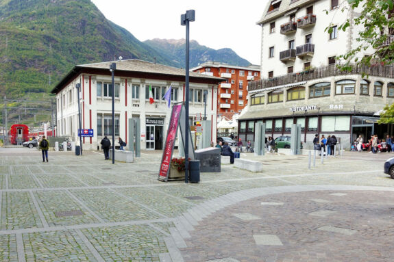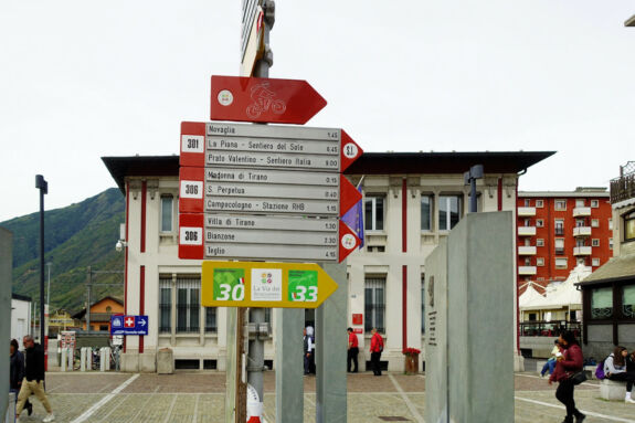 Bis zum Bahnhof der Berninabahn und dem gegenüberliegenden Bahnhof der italienischen Staatsbahn folgen wir der stark befahrenen Straße mitten durch die Stadt. Eine schöne Allee begleitet uns auf dem Trottoir. Nach ca. 900 Metern wird rechts, etwas zurückversetzt, das Stationsgebäude der FS sichtbar. Nach dem Genuss eines Espresso und eines Gelato warten bereits im unmittelbar daneben stehenden Bahnhof der Berninabahn die Züge, die uns wieder zurück nach Morteratsch bringen.