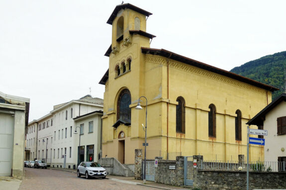 Auf dem schmalen Pfad wandern wir nun auf italienischem Boden weiter leicht abwärts, überqueren die Bahnlinie, erreichen die Autostraße, verlassen diese aber sofort wieder auf einem Fußweg und überqueren abermals die Bahnlinie. Auf einem angenehmen Weg steigen wir nun hoch zur Chiesa di Santa Perpetua. Hier bietet sich ein fantastischer Ausblick auf die Stadt Tirano. Gut können wir auch von hier die Fahrten der Züge durch die Stadt beobachten.