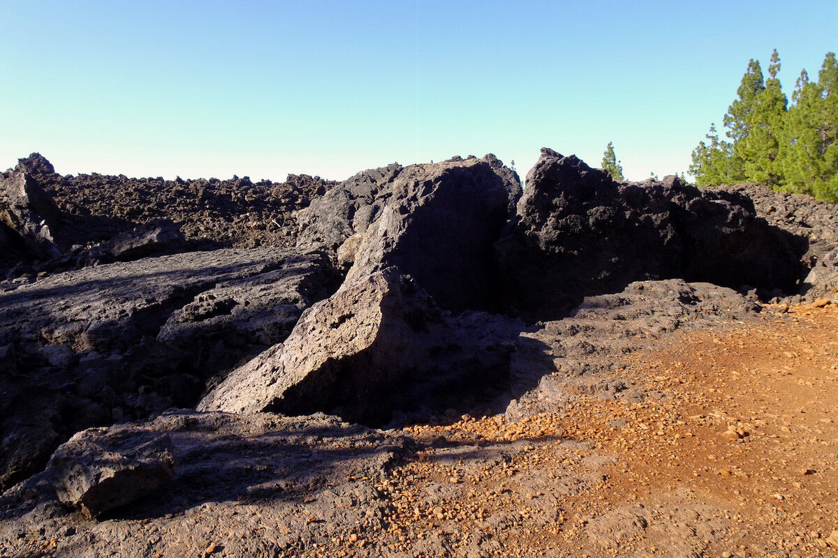 Besonders spektakulär ist der Rückweg über den Circular Chinyero. Der gut ausgebaute Wanderweg schlängelt sich durch ein großes schwarzes Lavafeld. Kleine und große, teilweise haushohe Lavabrocken liegen oder stehen um uns herum. Noch ist das Gebiet kaum bewachsen, monoton schwarz ragt der Vulkan aus der Lava. Nur ganz langsam kehrt das Leben hierher zurück, die wenigen Bäume wirken etwas verloren in der schwarzen Lavawüste.