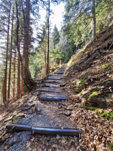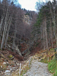 Der Weg vom See hinauf zum Berggasthaus Aescher verläuft steil am Felshang in vielen Kehren aufwärts, teilweise recht felsig. Er ist an zahlreichen Stellen gut gesichert. Bäume verdecken meist die Sicht nach unten, was ein angenehmes Gefühl von Sicherheit vermittelt, auch wenn es wohl trügerisch ist. Fallen möchte ich hier auf keinen Fall.