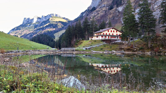 Der Geologe Albert Heim (1849 bis 1937) soll den Alpstein als schönstes Gebirge der Welt bezeichnet haben. Das Massiv besteht aus drei markanten, kettenartig angeordneten Berggraten, die parallel von Südwesten nach Nordosten verlaufen. Die drei Gebirgszüge, die im Osten mit Ebenalp, Alp Sigel und Hoher Kasten enden, sind jeweils bequem mit einer Seilbahn erreichbar. Zwischen ihnen liegen auf Appenzeller Seite mehrere kleine Bergseen eingebettet in die Täler des Alpsteins: Seealpsee, Sämtisersee und Fälensee. Über dem Bodensee hält sich seit Tagen eine dichte Nebeldecke, und so wandere ich heute von Wasserauen zum Seealpsee und weiter hinauf zur Ebenalp.