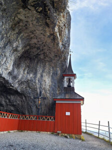Vom Aescher geht dann ein guter und breiter Weg erst am Felshang entlang zum Wildkirchli. Dann schlängelt sich ein Gang durch eine beleuchtete Karsthöhle und schließlich steil hinauf zum Berggasthaus Ebenalp.