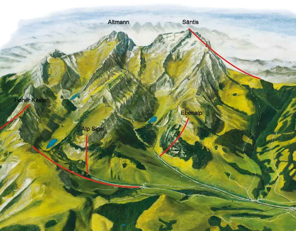 Der Geologe Albert Heim (1849 bis 1937) soll den Alpstein als schönstes Gebirge der Welt bezeichnet haben. Das Massiv besteht aus drei markanten, kettenartig angeordneten Berggraten, die parallel von Südwesten nach Nordosten verlaufen. Die drei Gebirgszüge, die im Osten mit Ebenalp, Alp Sigel und Hoher Kasten enden, sind jeweils bequem mit einer Seilbahn erreichbar. Zwischen ihnen liegen auf Appenzeller Seite mehrere kleine Bergseen eingebettet in die Täler des Alpsteins: Seealpsee, Sämtisersee und Fälensee. Über dem Bodensee hält sich seit Tagen eine dichte Nebeldecke, und so wandere ich heute von Wasserauen zum Seealpsee und weiter hinauf zur Ebenalp.